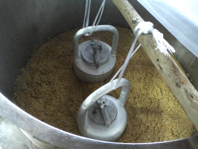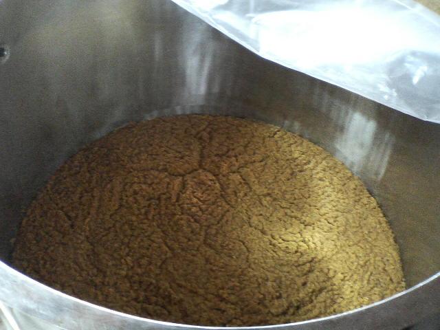 左が3日前に粉砕し仕込み終えた状態で、右は本日品温が上昇した為、暖気樽と呼ばれるアルミの容器に氷を入れて冷やしているところです。