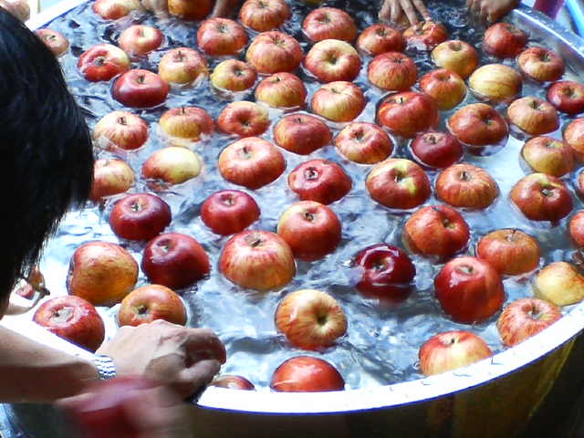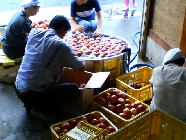 さて、無農薬なのでゴシゴシと洗う必要はないのですが、輸送中に付いたホコリなどを落とすために「半切り」と呼ばれるたらいのような容器でりんごを洗います。