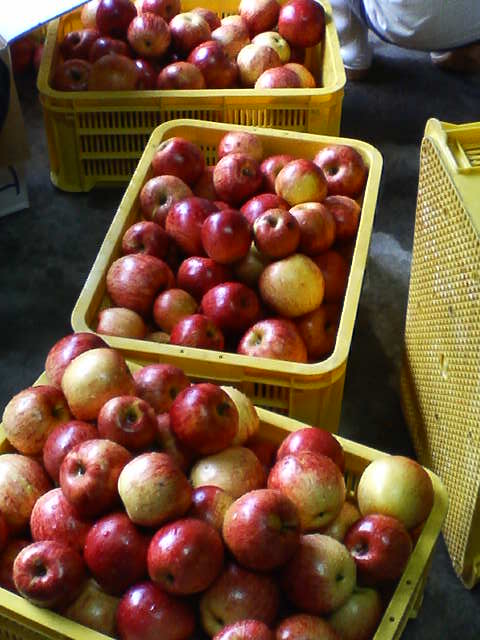 地元のパートさんにも手伝ってもらいピカピカになったりんご達はこれからミキサーで粉砕されます。