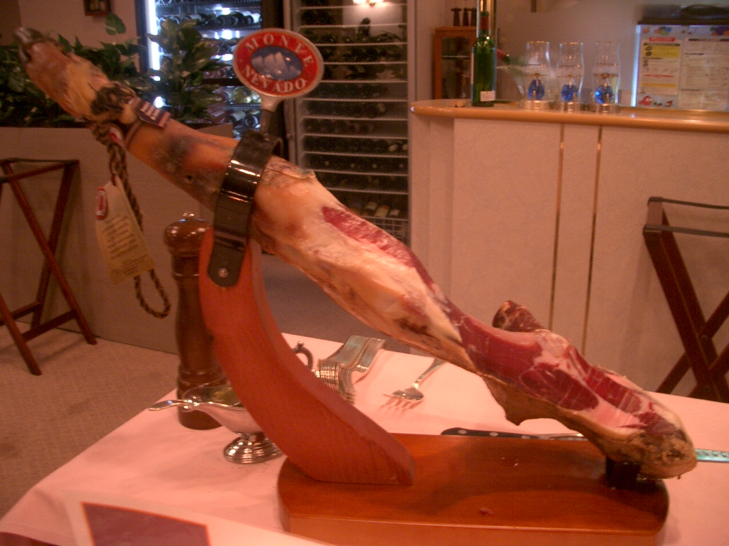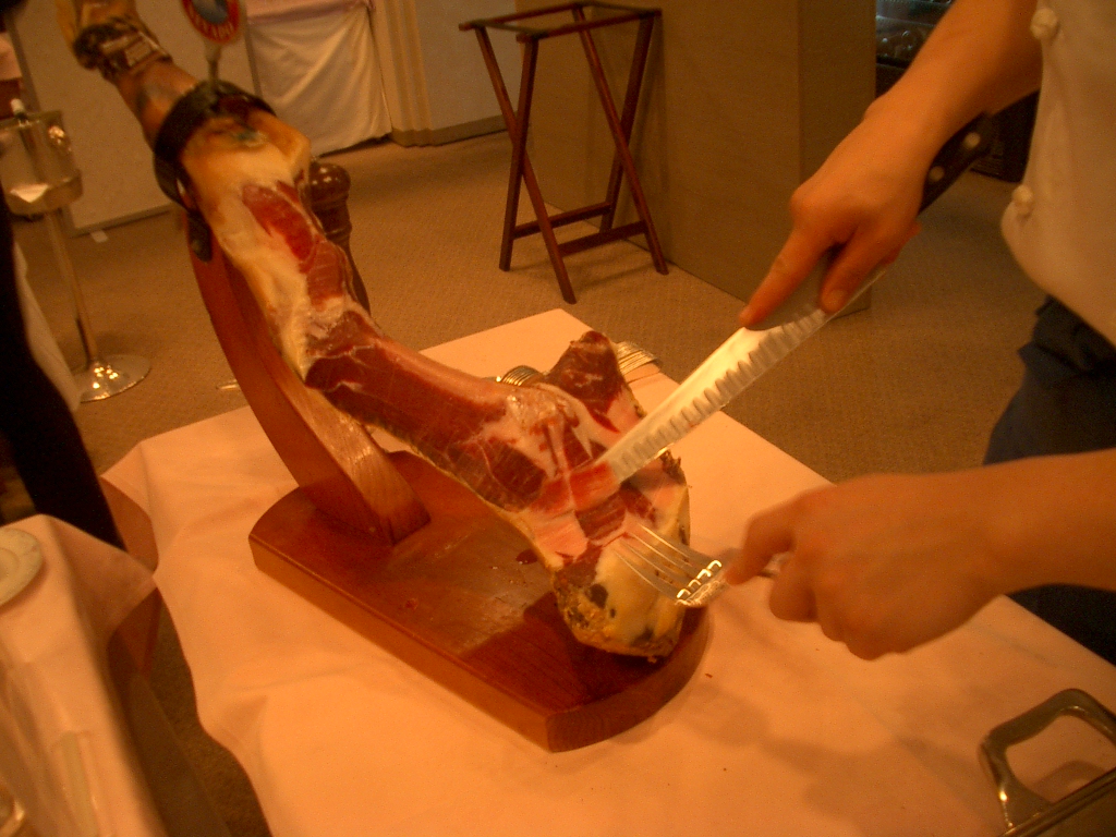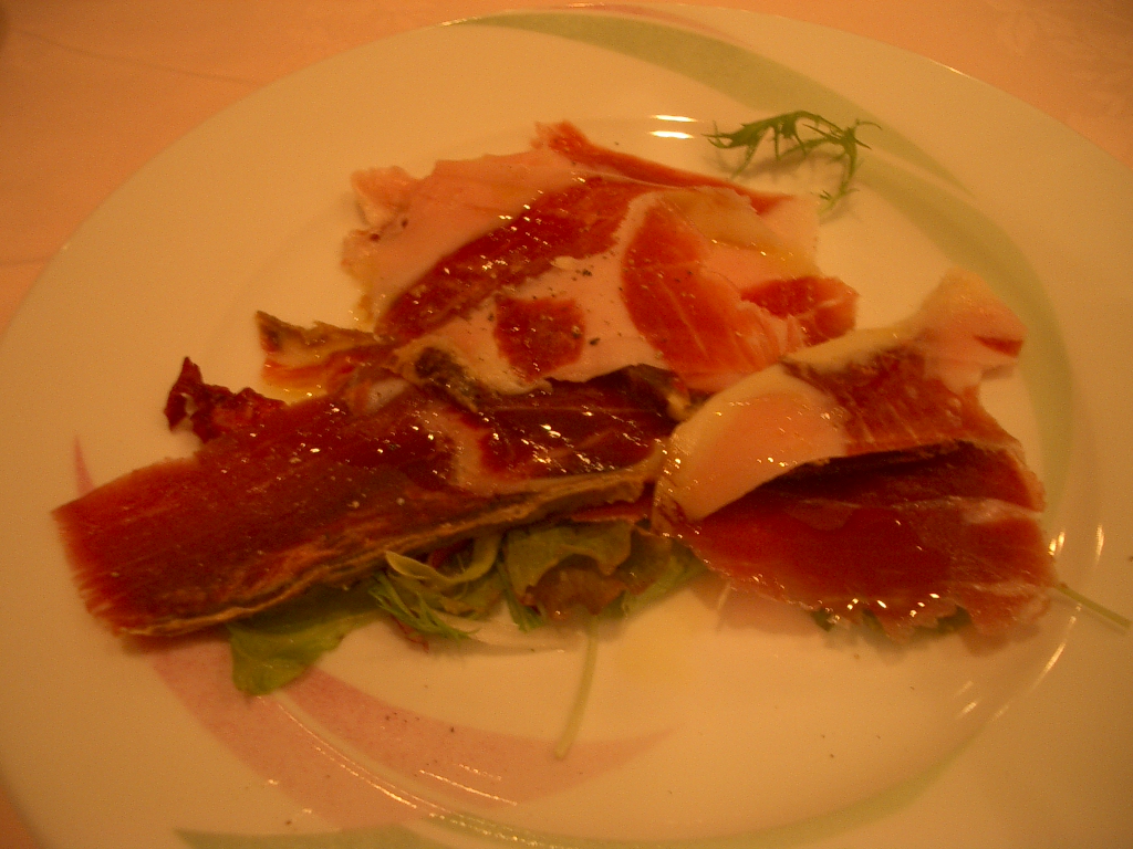 目の前でサーブしてくれました。この豚はドングリの実を食べて大きくなる、と聞いた事があります。そのせいか、油の融点が非常に低いので、その甘みを楽しむことが出来ます。スペイン料理屋に行くと食べさせてもらえるけど、宮津で食べられるとは。