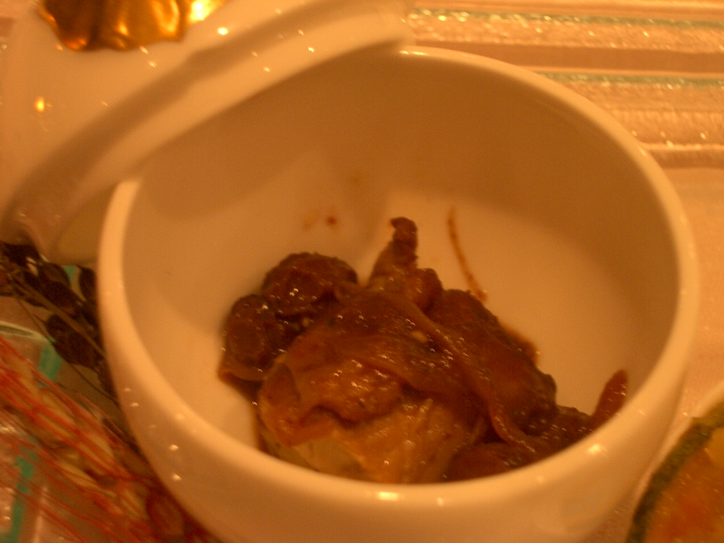 酢で煮込んであるといっても酸味はそれほど感じられません。赤ワイン煮込みのアレンジなので、赤わいん酢を煮詰めて、よく酸味を飛ばしてあるから?