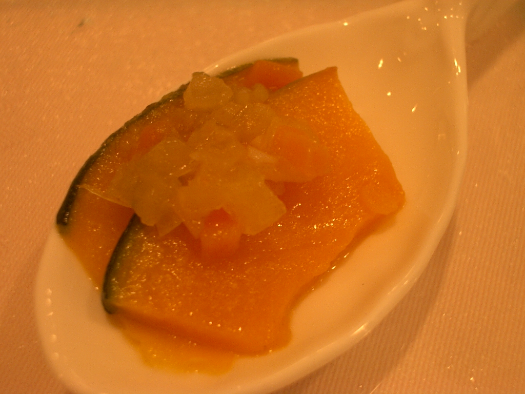 蒸した南瓜のマリネ。南瓜酢を使っているのがミソ。