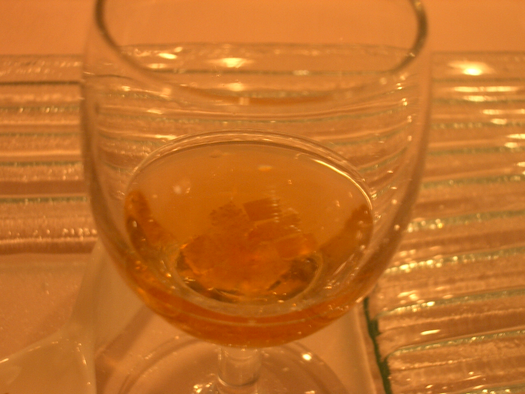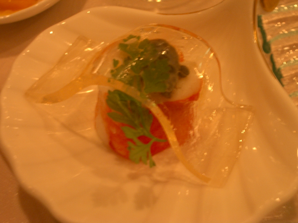 茹でたたらば蟹の上の透明の寒天状のものは梨酢に甘みを加えたもののようです。つまり洋風の蟹の酢の物。