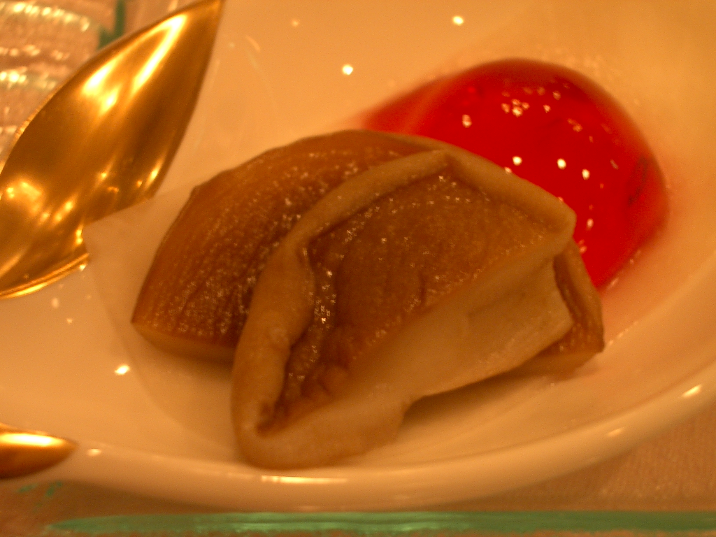 きのこにさっと火が通してあり、それを紅芋酢のこんにゃく(ゼリー?)の酸味と共に。紅芋酢の鮮やかな色が写真では・・・。他のお客さんに迷惑がかかるので、いつもフラッシュなしで写真を撮るのですが、やはり伝わりづらいですな。