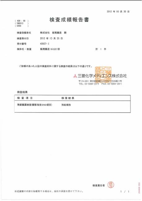 枚数はともかく、1検体につき数万円の費用がかかります。全契約農家の検査費用の半分を飯尾醸造が負担していますので、毎年けっこうなコストがかかるのです(初年度のみ、飯尾醸造が全額負担)。