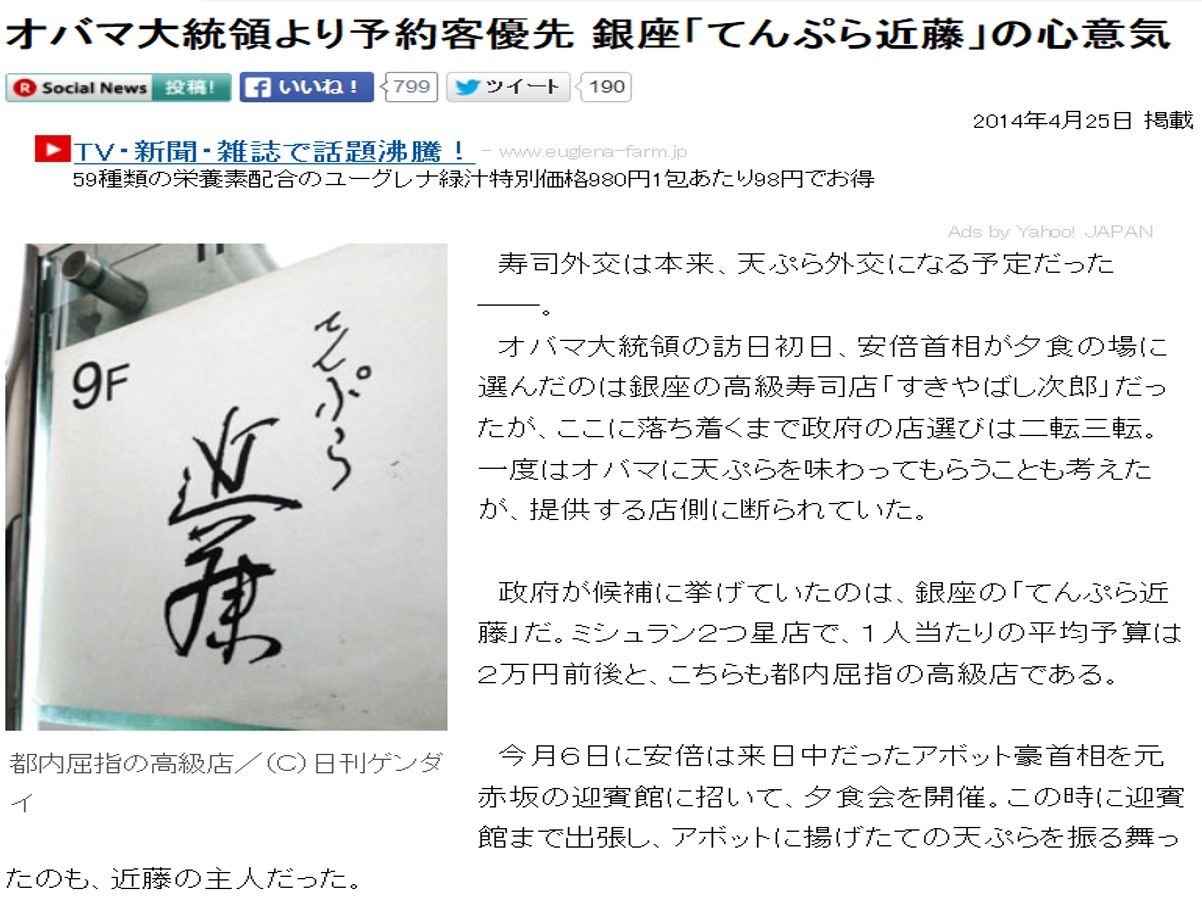 先月、オバマ大統領の訪日の際、夕食の場として打診された近藤さんが予約客を優先するため断ったという記事。お人柄の表われたエピソードとして今後も近藤ファンの胸に刻まれることでしょう。
