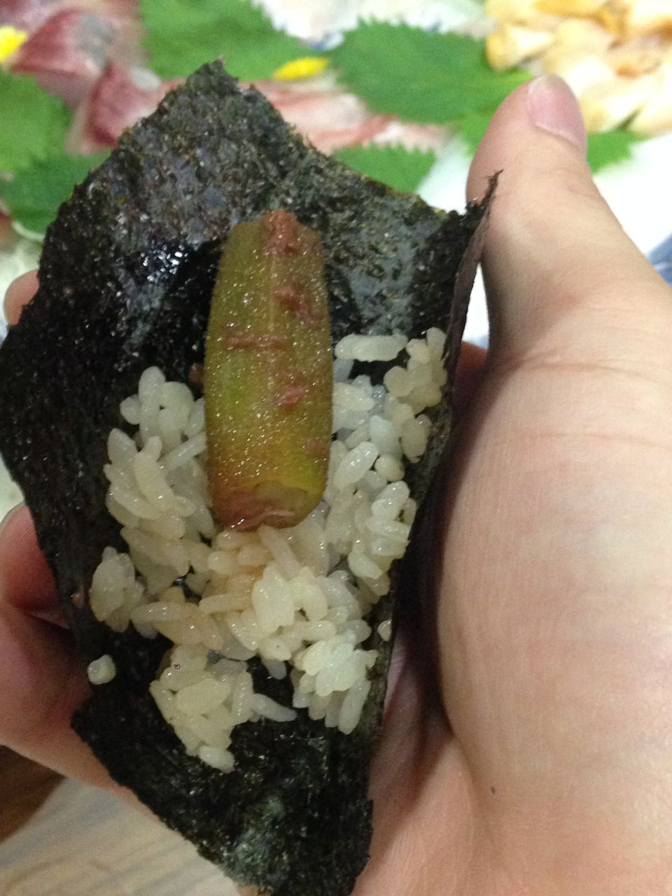 答えはキュウリ。茹でたオクラに生のきゅうりを詰めて、パリッとした食感を出していました。お上手。