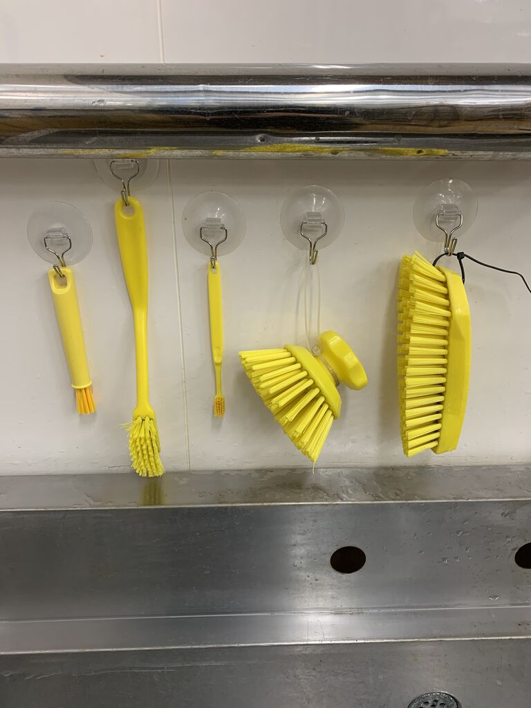 調合室には掃除用のブラシが何点かあるのですが、タンクなどの綺麗なモノに使用するブラシと、床などの汚染場所に使用するブラシと間違っては大変なので、色分けをして管理しています。