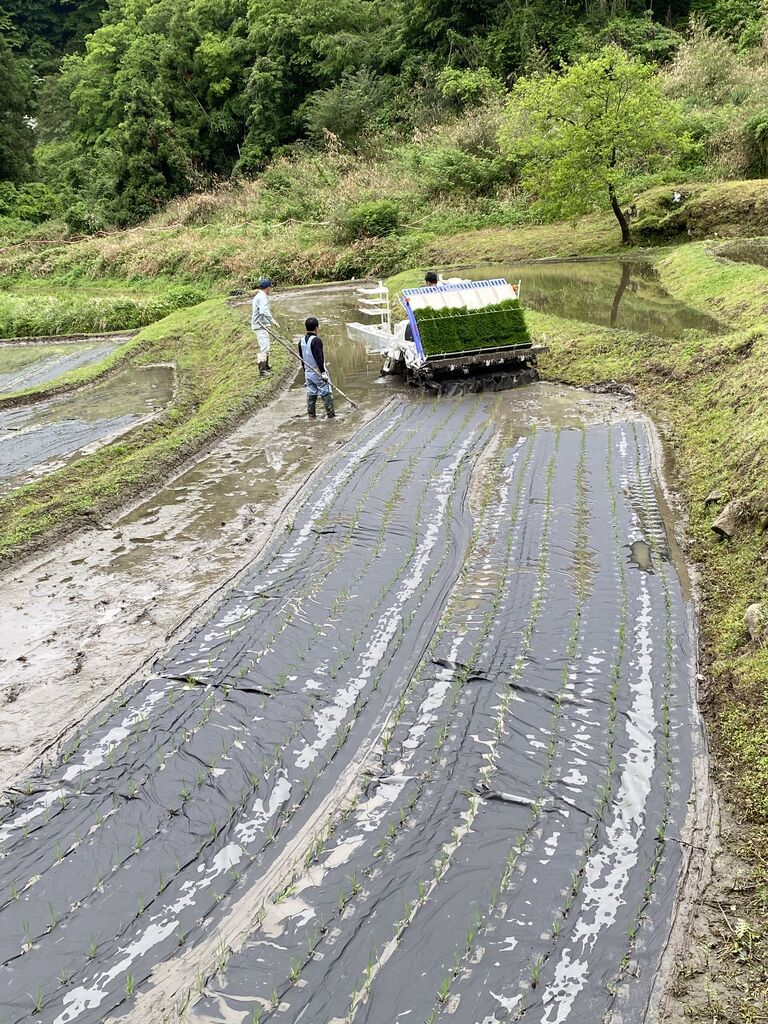 今年、棚田で数年ぶりに乗用の紙マルチ田植機を使用しました!過去に使用した時は、田んぼの中で機械がスタックしたり、出口でスタックしたり、いい思い出がなくて悲惨な思い出の方がいっぱいあるので同じ事の無いようドキドキしながら田植えを行いました。