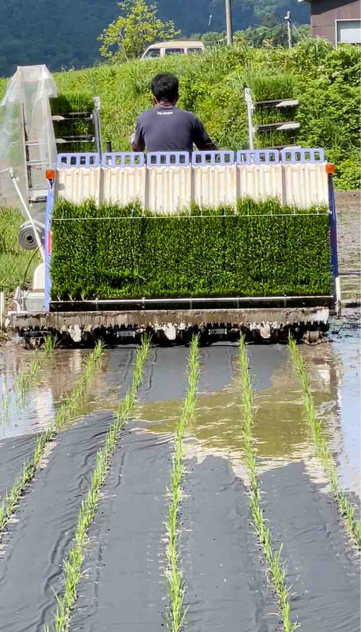 紙マルチを使っての田植えです。 品種はコシヒカリです。飯尾醸造の契約農家さんには五百万石を栽培して頂いてます。無農薬の栽培なので紙マルチを使う事によって、初期の雑草を抑え標高400メートル以上の棚田で栽培している為、地温の低下予防もあります。