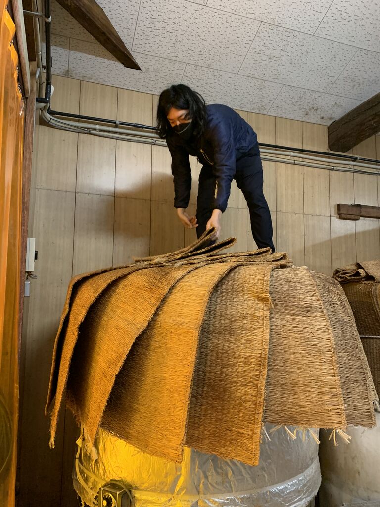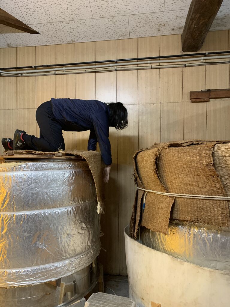 今回の仕込みでは容量1500Lのタンクを使用しました。タンクの蓋をしてムシロ掛け開始です。