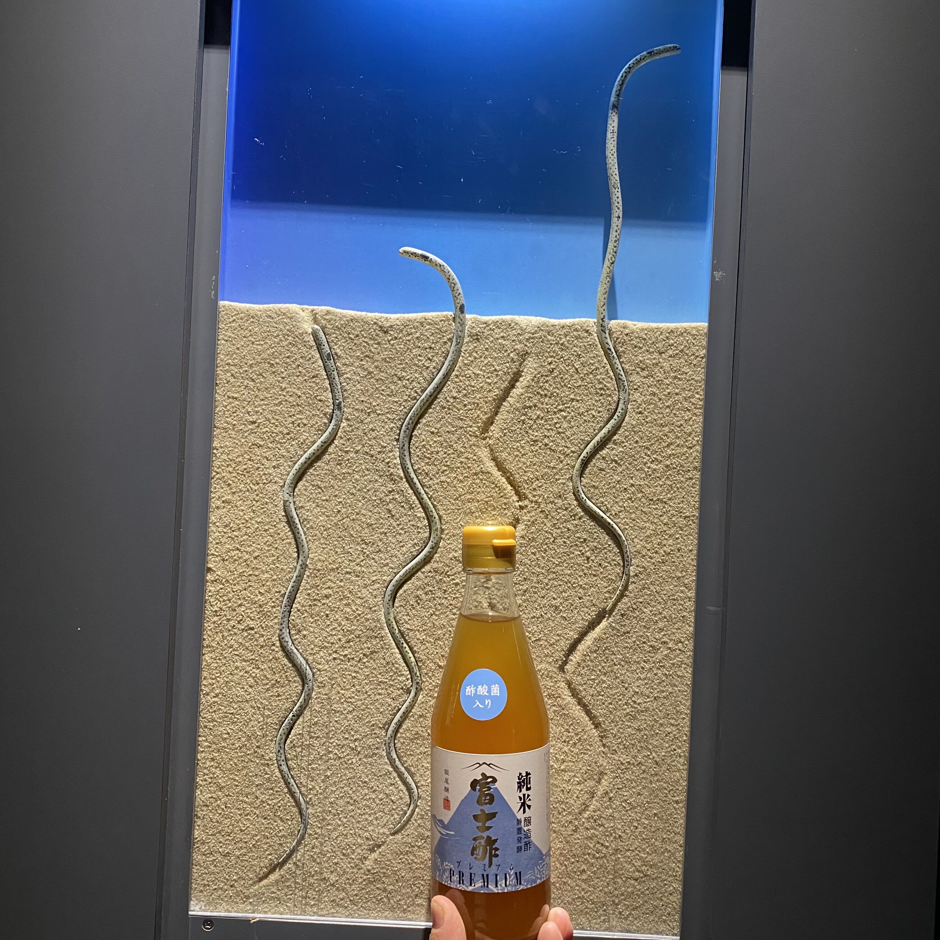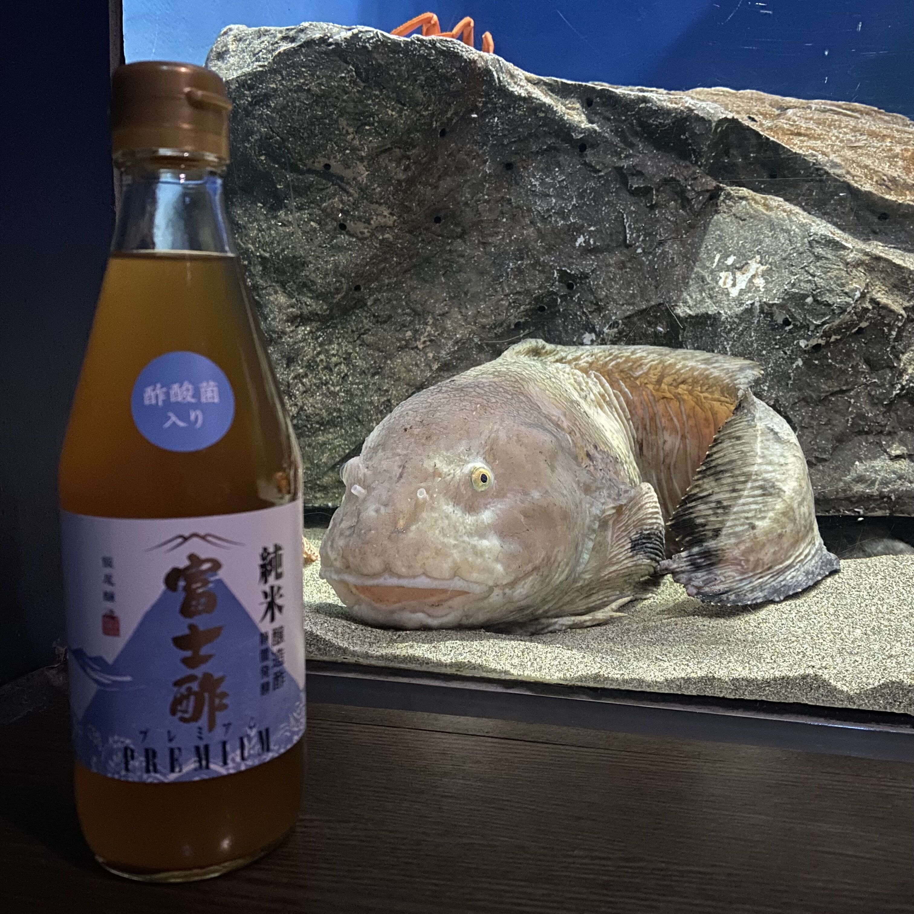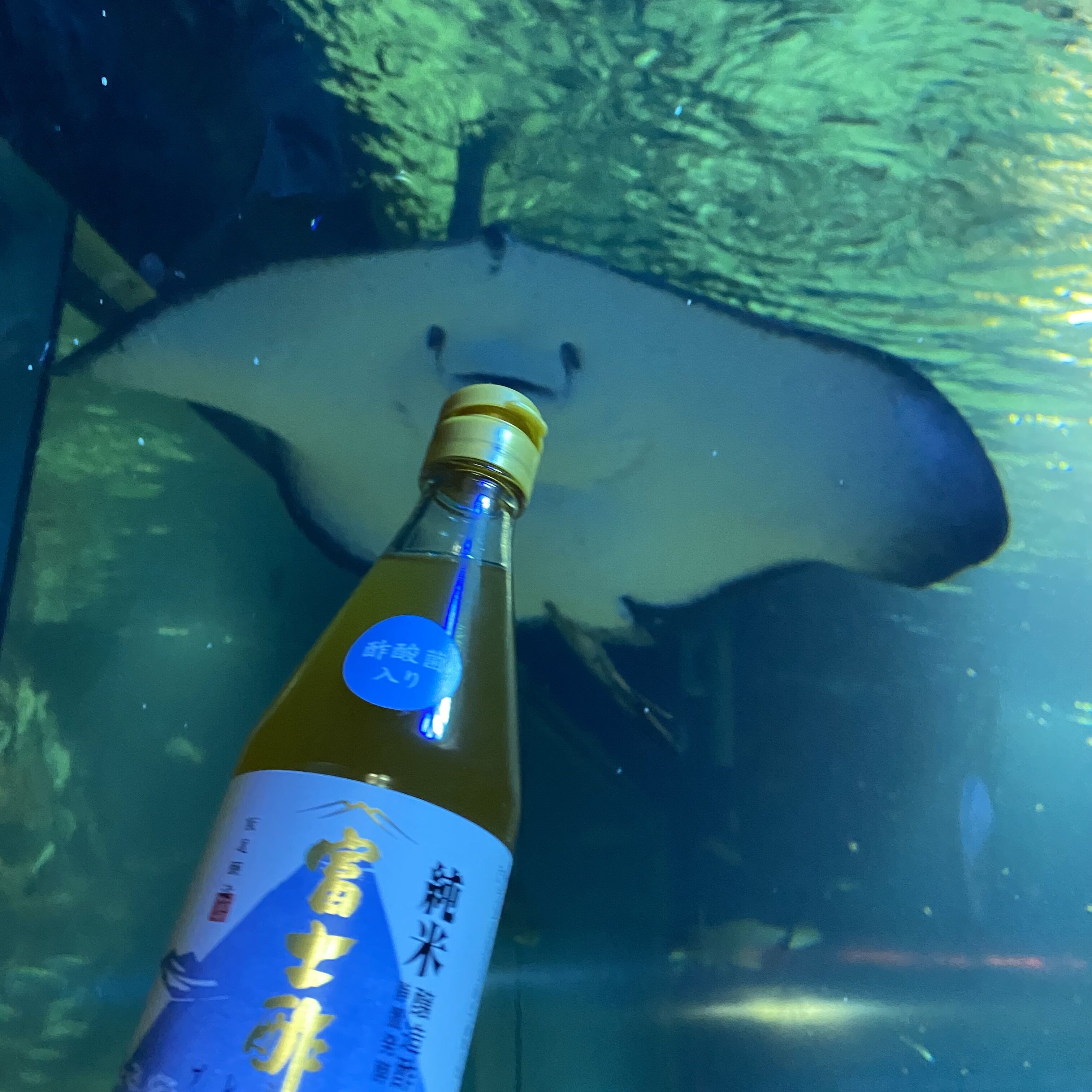 先ずは日本海大水槽で巨大なエイがニコニコ興味津々に酢酸菌入りくんに近寄ってくれました😄