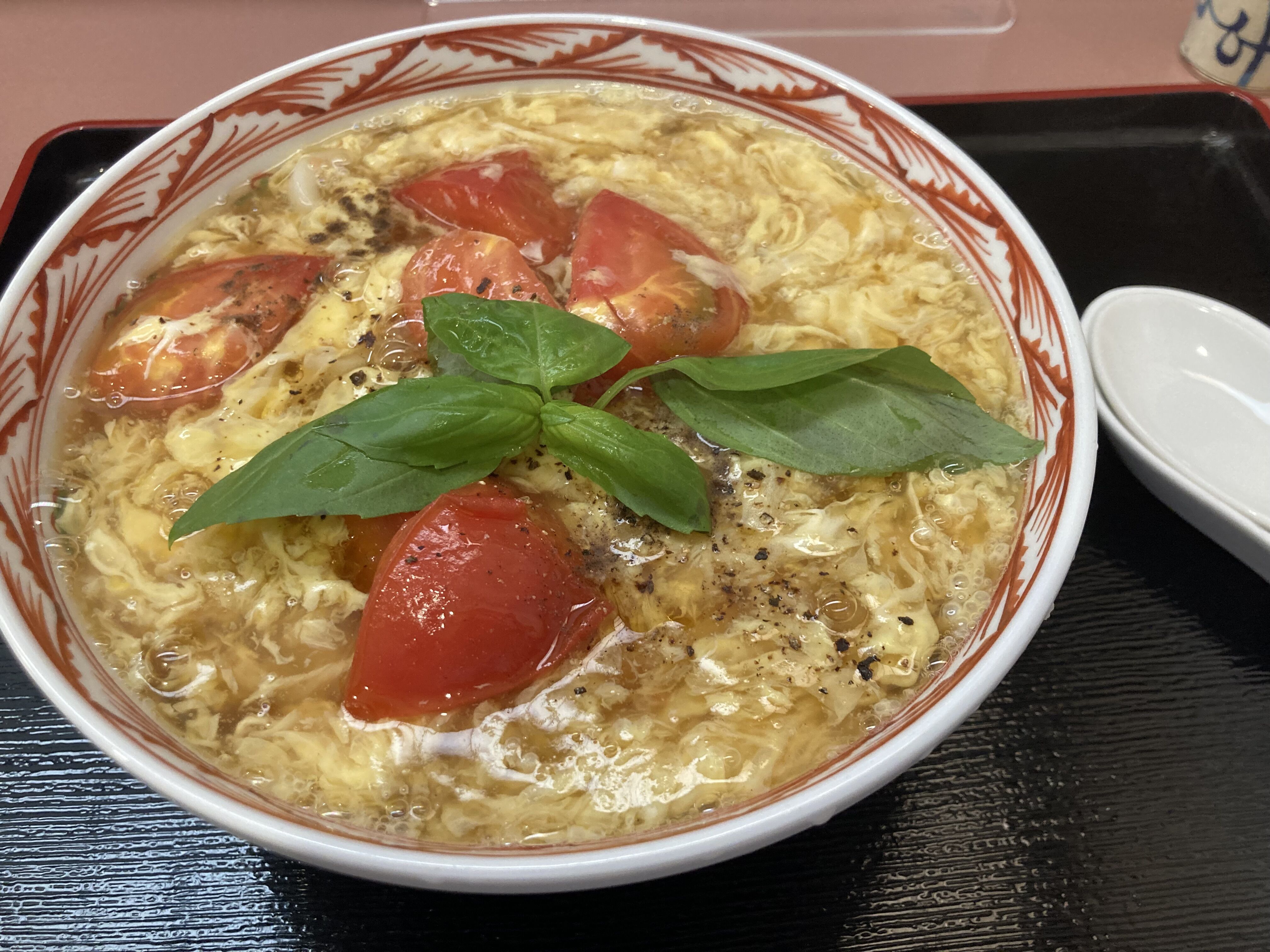 トマトとたまご。今年初めて出た新メニュー。和、洋、中が合わさった感じでバジルつき。