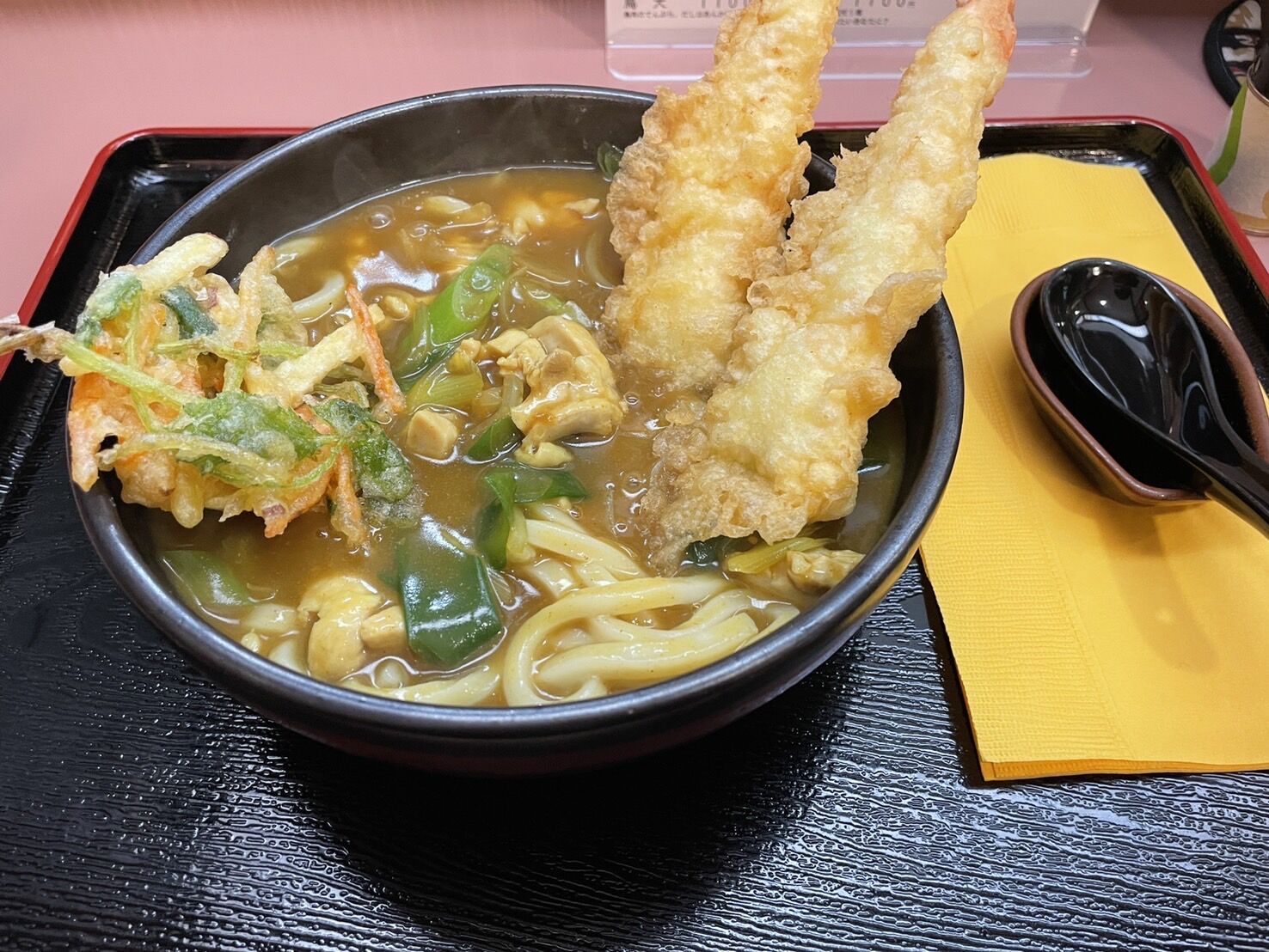 えび天カレー。こちらも大きい2尾のえび天で提供されます。必ずルーが残るのでご飯を注文してカレーライスにして食べましょう。