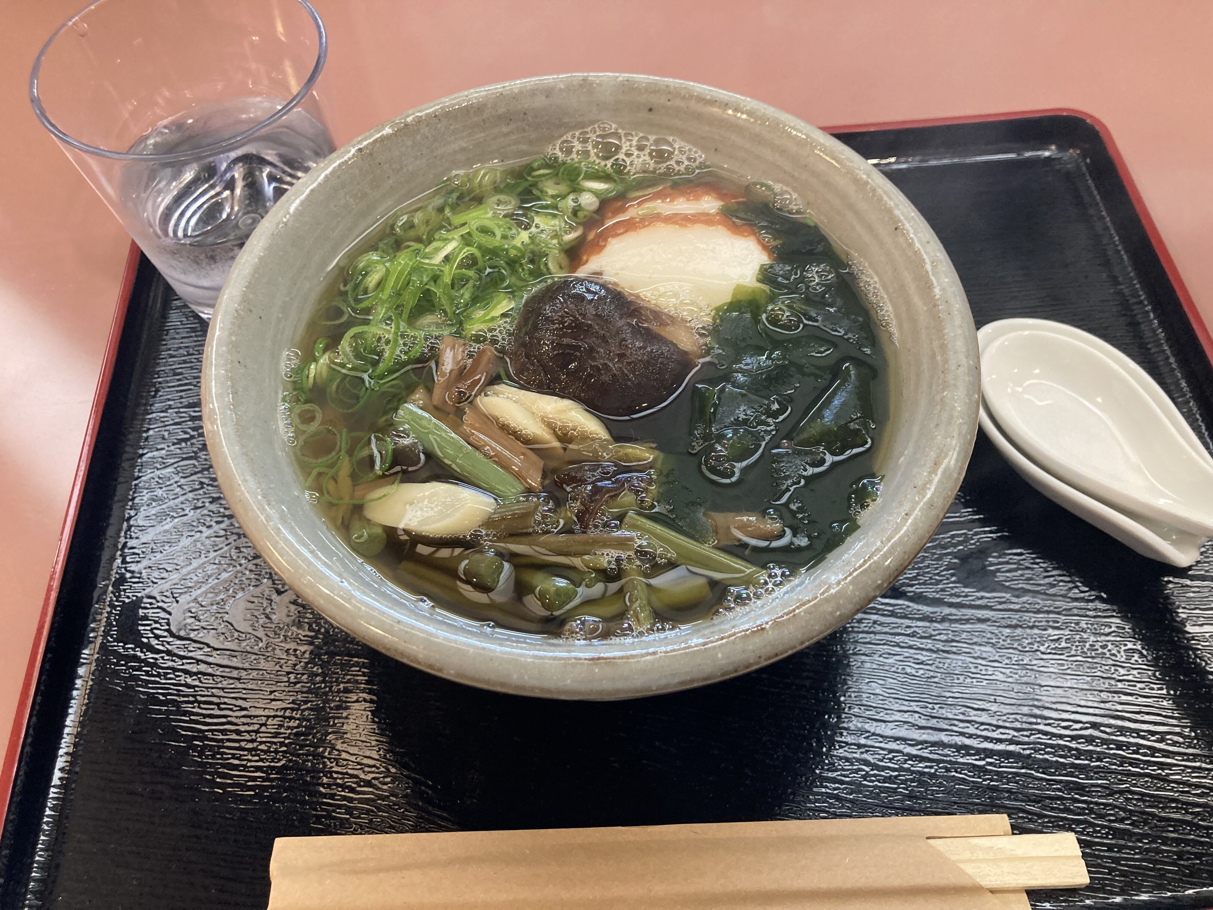 山菜。山菜、椎茸、わかめがはいったあっさり系のうどんです。