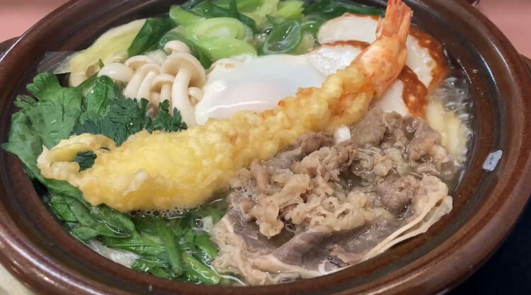 こんぴら鍋。えび天、牛肉、野菜全て入った贅沢おうどん。沸騰した状態で提供されます笑