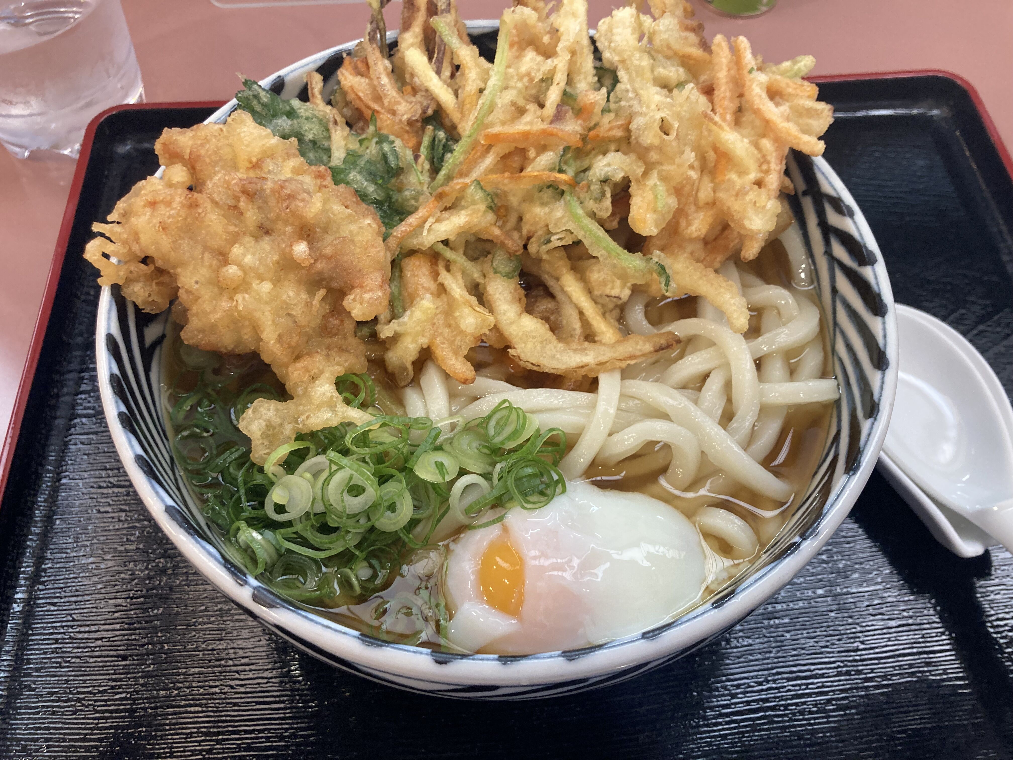 野菜天。野菜のかき揚げが2つ入っています。提供直後にサクッとひとくち。出汁を染み込ませてふたくち。卵と絡めてさんくち。最高です。