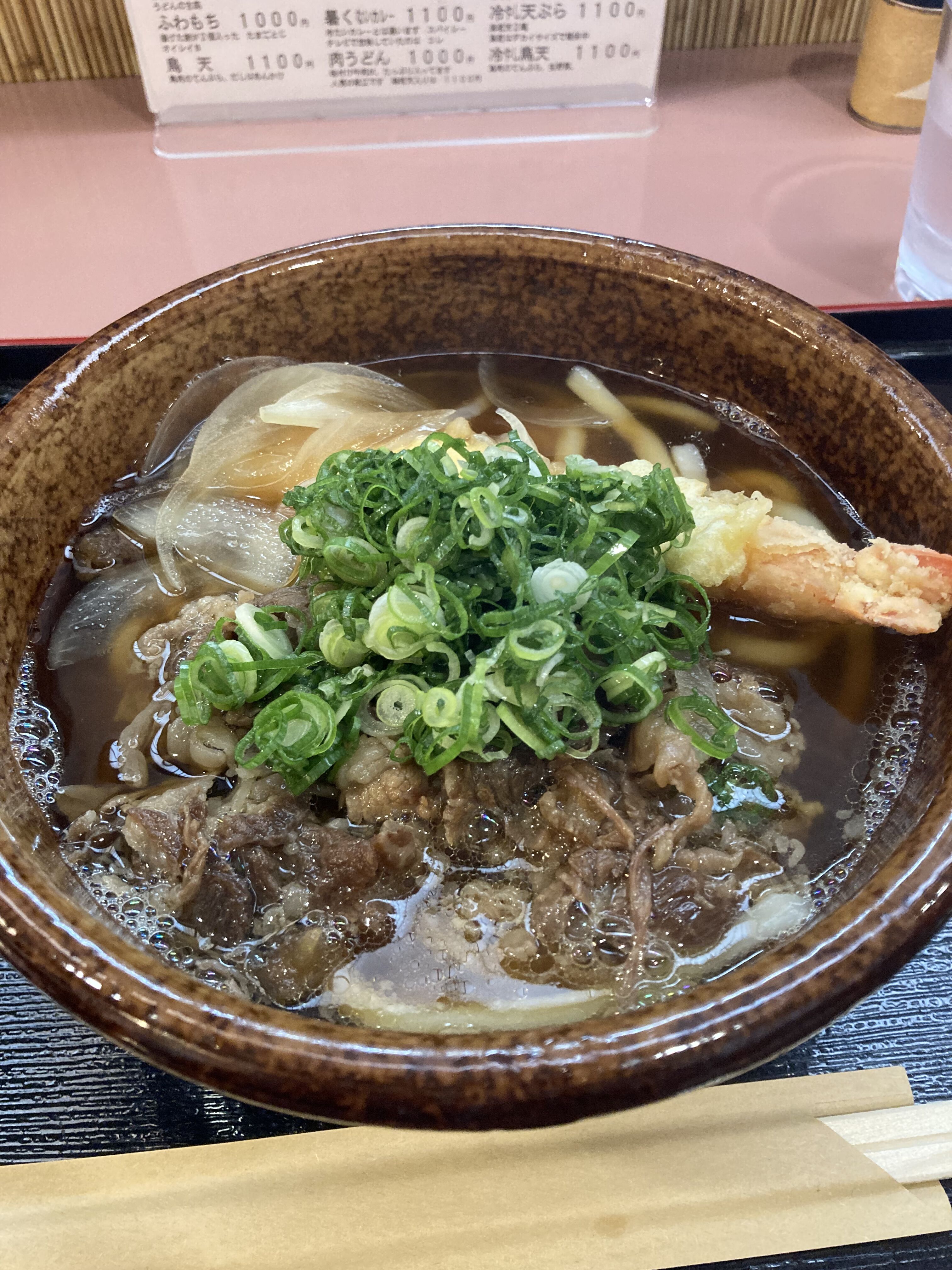 肉天。肉うどんにえび天が1尾入っています。あれもこれも食べたいあなたにおすすめです。肉うどんだけ食べたい方は肉うどんというメニューもあります。