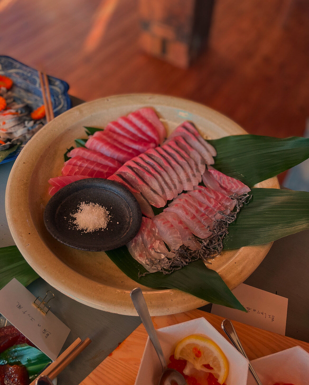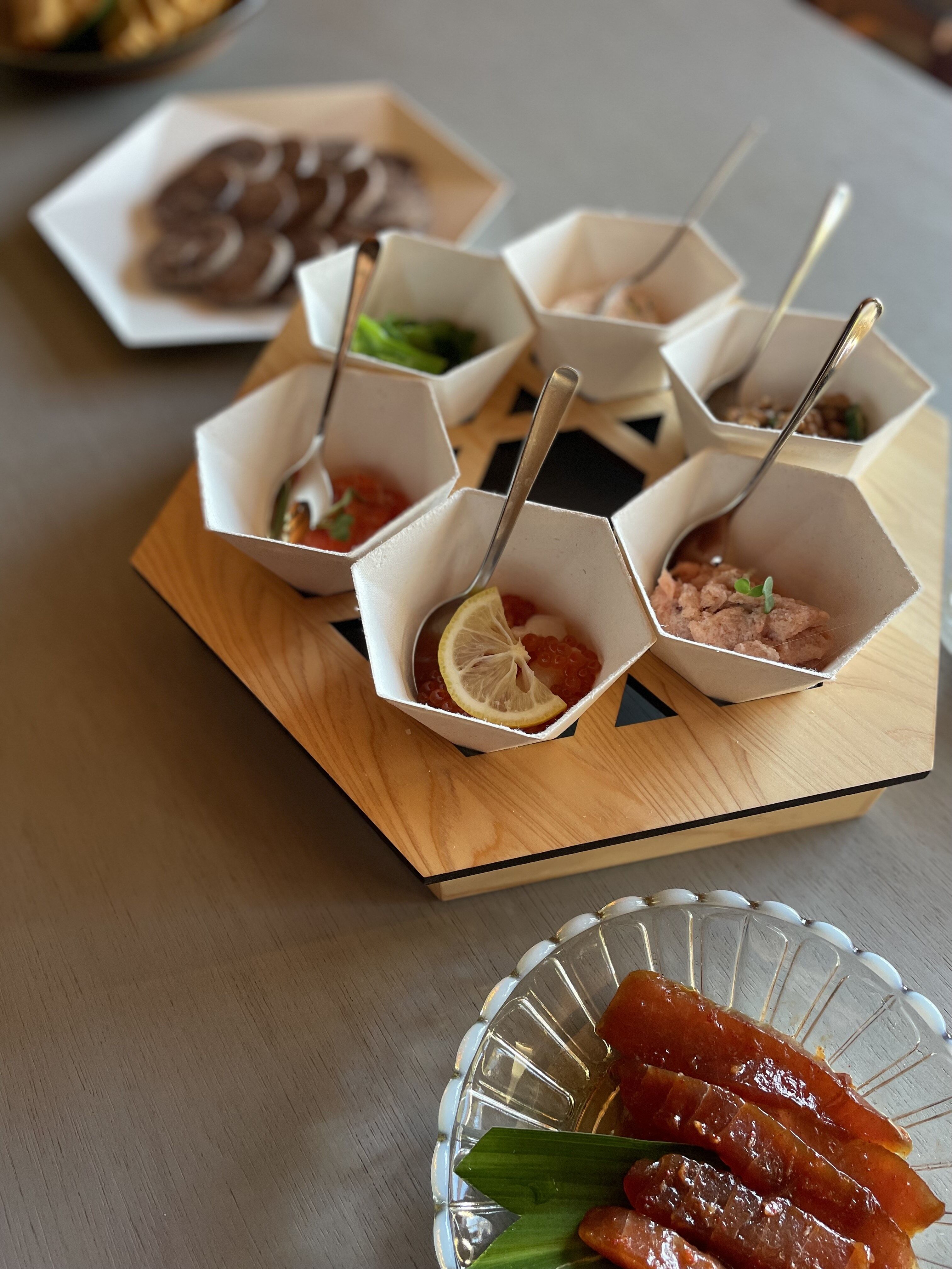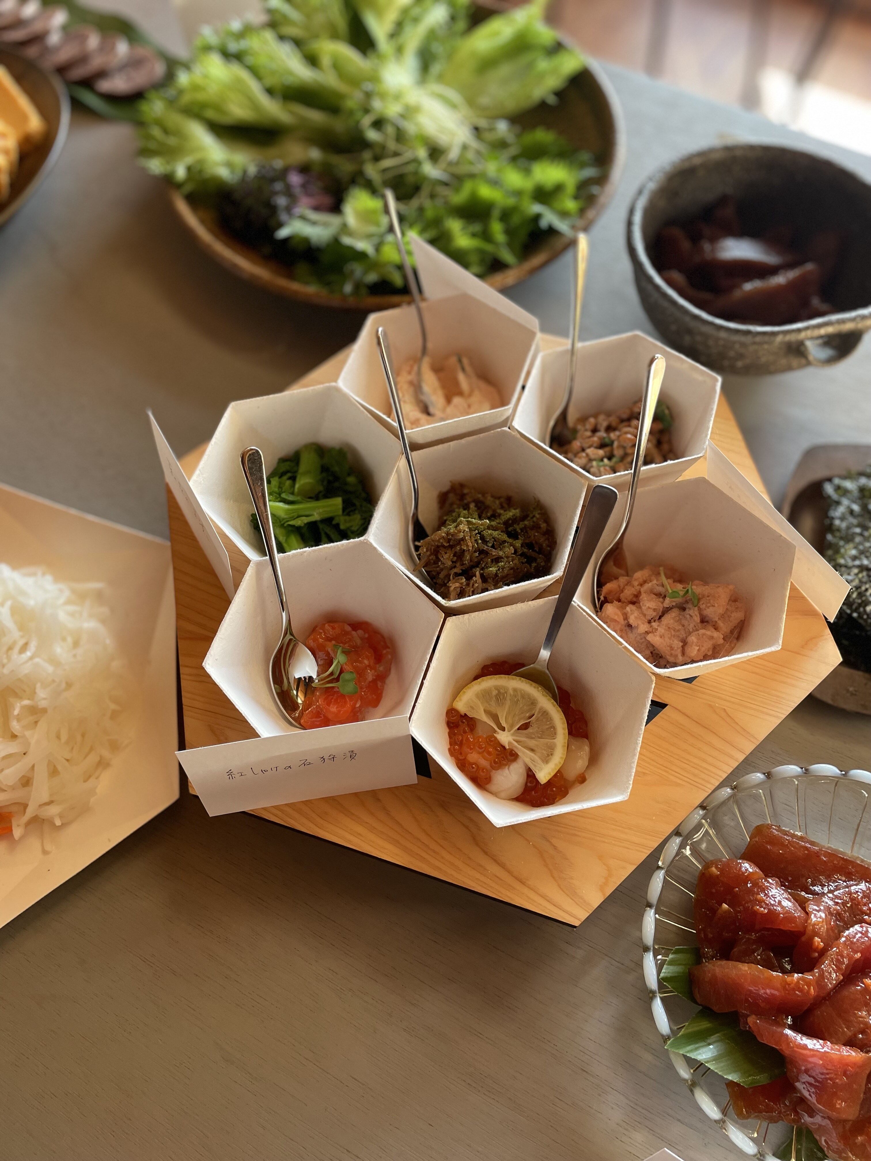 お刺身具材は、醤油を使わず塩昆布を添えるだけ。今回の会場を提供してくださったオーナーマダムのアイデア。