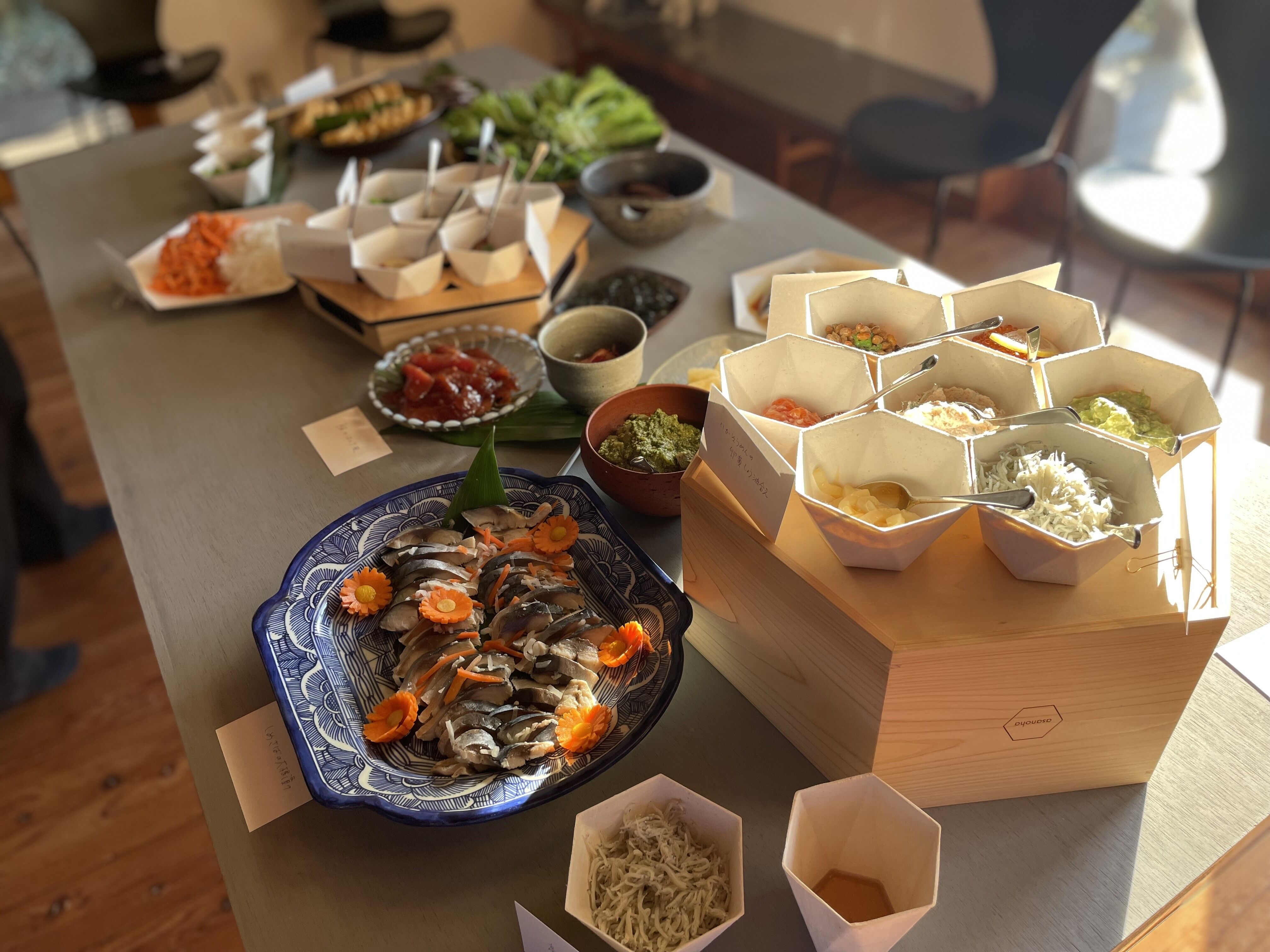 この日の具材は、逗子、葉山、鎌倉、茅ケ崎など湘南の食材が並び、主催者が居住するイタリアピエモンテからの味覚、又、来日途中に経由した韓国の味覚、私たちの丹後の味覚がアクセントを加えて。