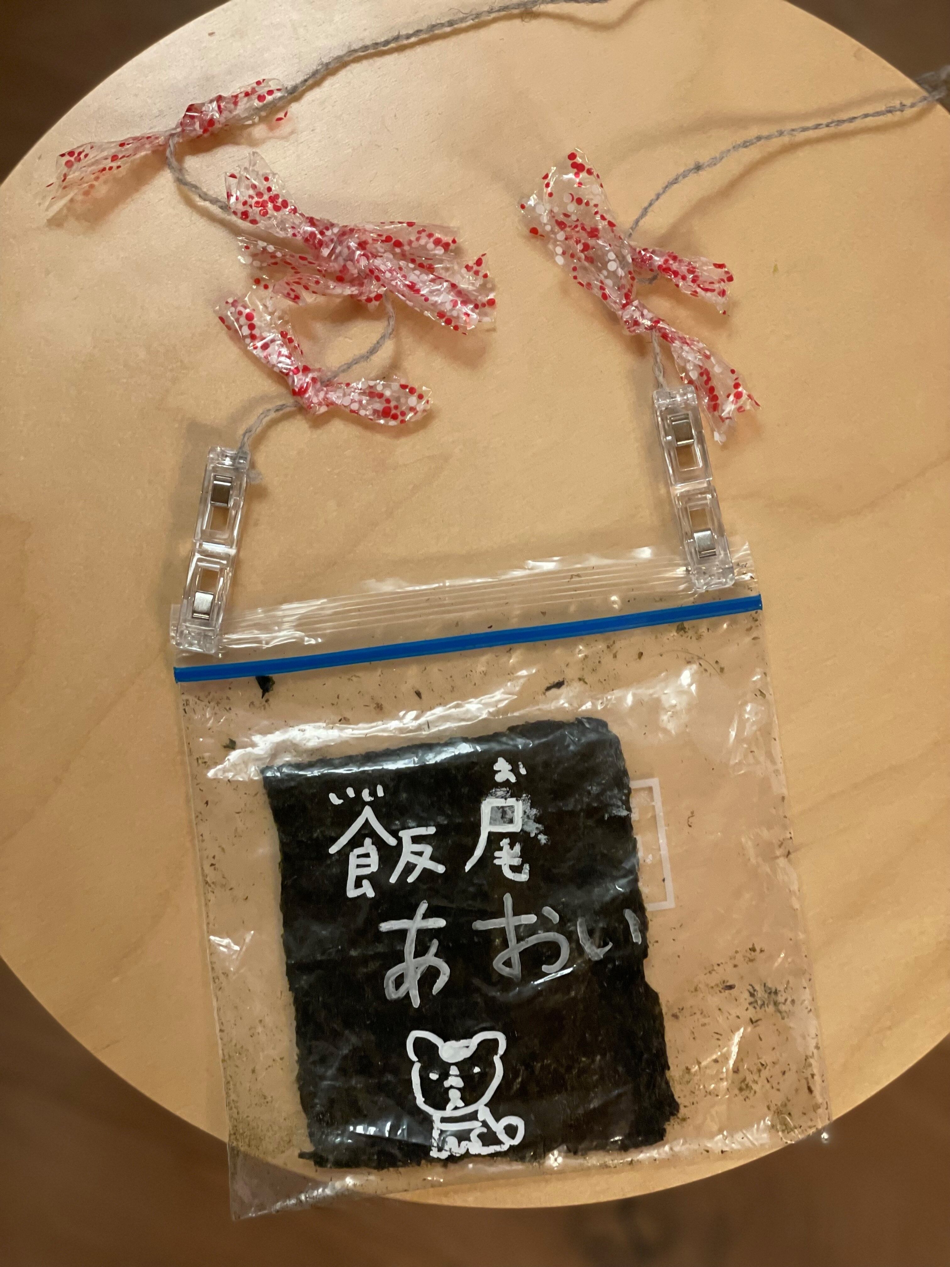 ちなみにこの日、”接遇係”を担当した娘(8歳)の海苔袋の首掛けストラップは、ゲストのおもたせのスモークチーズを彼女がどれほどつまんだかを表すデコレーションに仕上がっておりました。