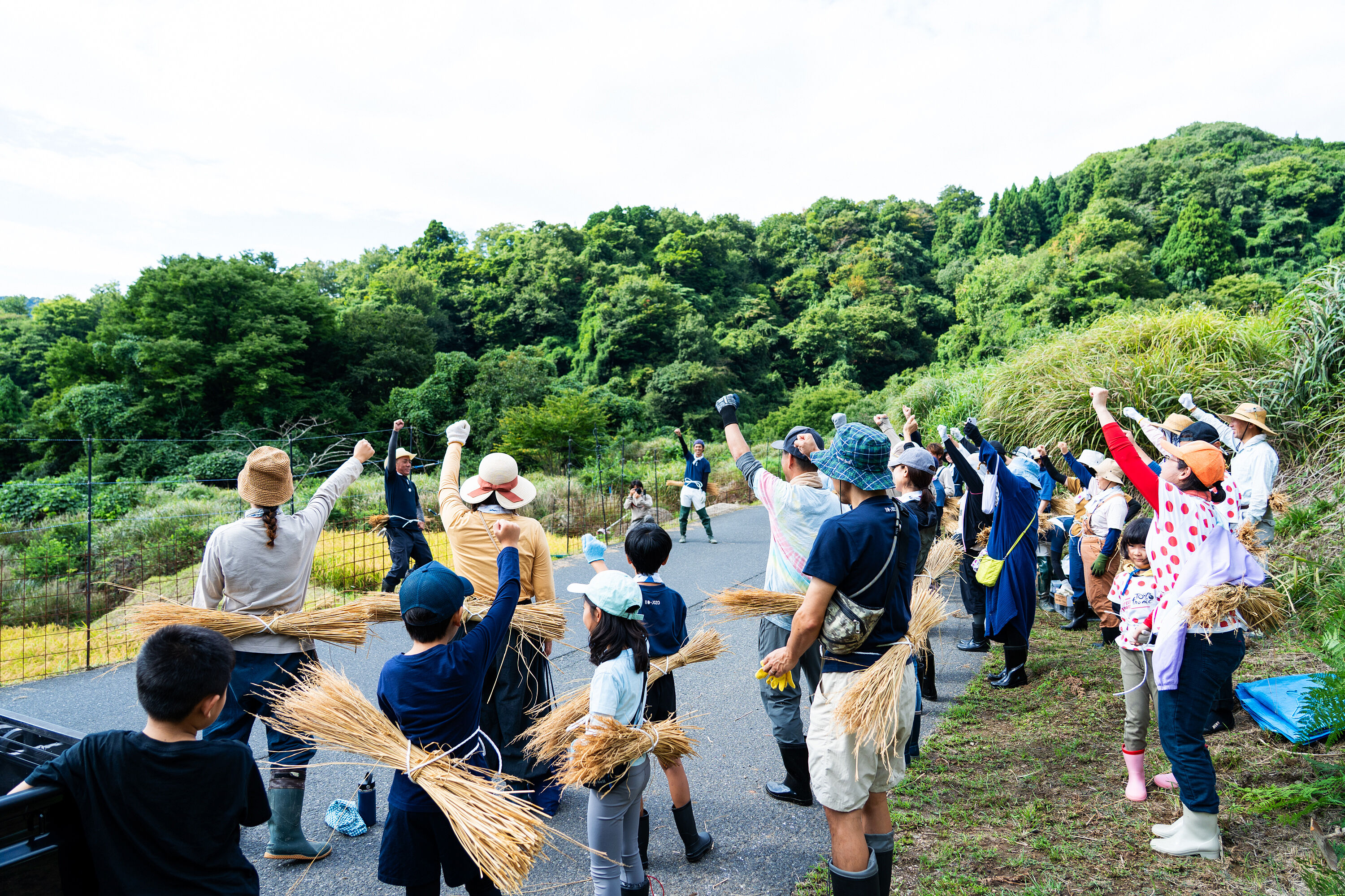 稲刈りリーダー、伊藤の掛け声でみんな一緒に気合を入れます。オー!