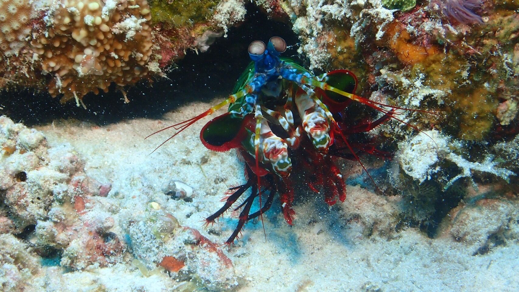 特徴: 体は赤・青・緑などとてもカラフルで、最大の特徴はそのパンチ力です。水槽のガラスを割るほど強力といわれています。人の爪も簡単に砕かれます。