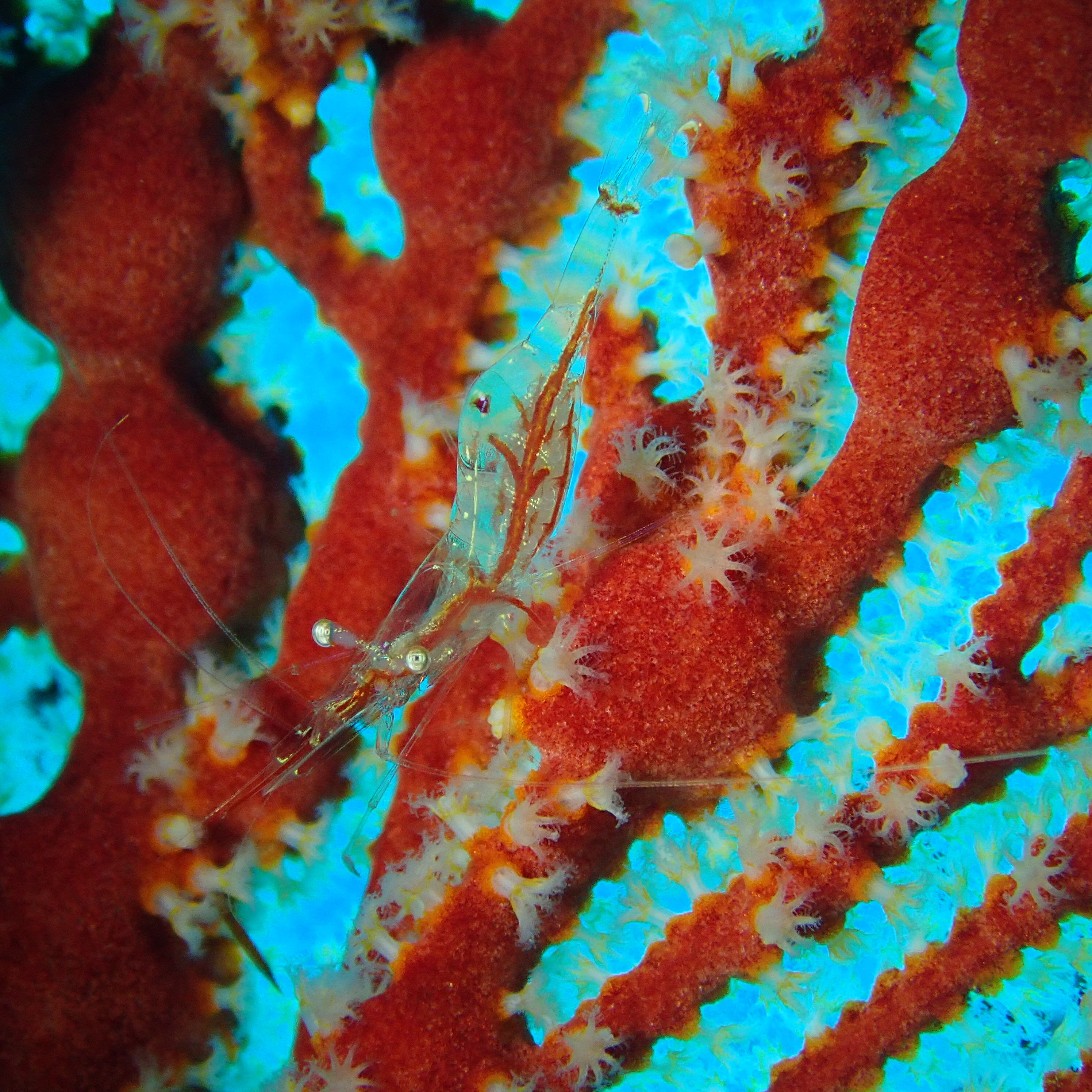 特徴: サンゴの一種「イソバナ」に隠れて暮らす小さなエビで、体の色がイソバナとそっくりなので見つけるのが大変。まるでカモフラージュしているかのようです。