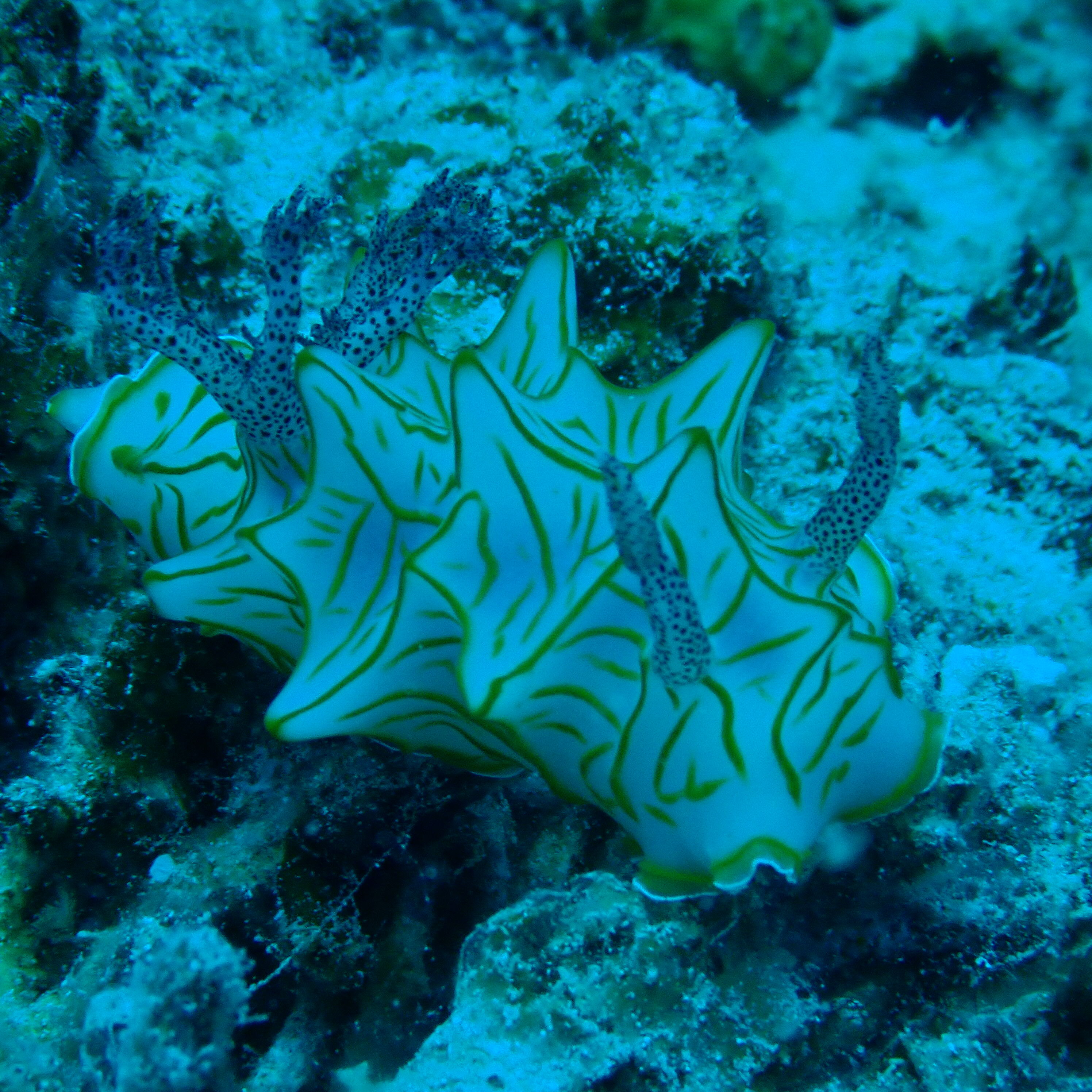 特徴: 体が半透明でぷるんとした質感をしており、そこに黄色いラインが入っています。見た目がとても可愛らしく、名前のとおり「寒天」のようです。慶良間の砂地や岩の上でゆっくり動いているのを見つけました。
