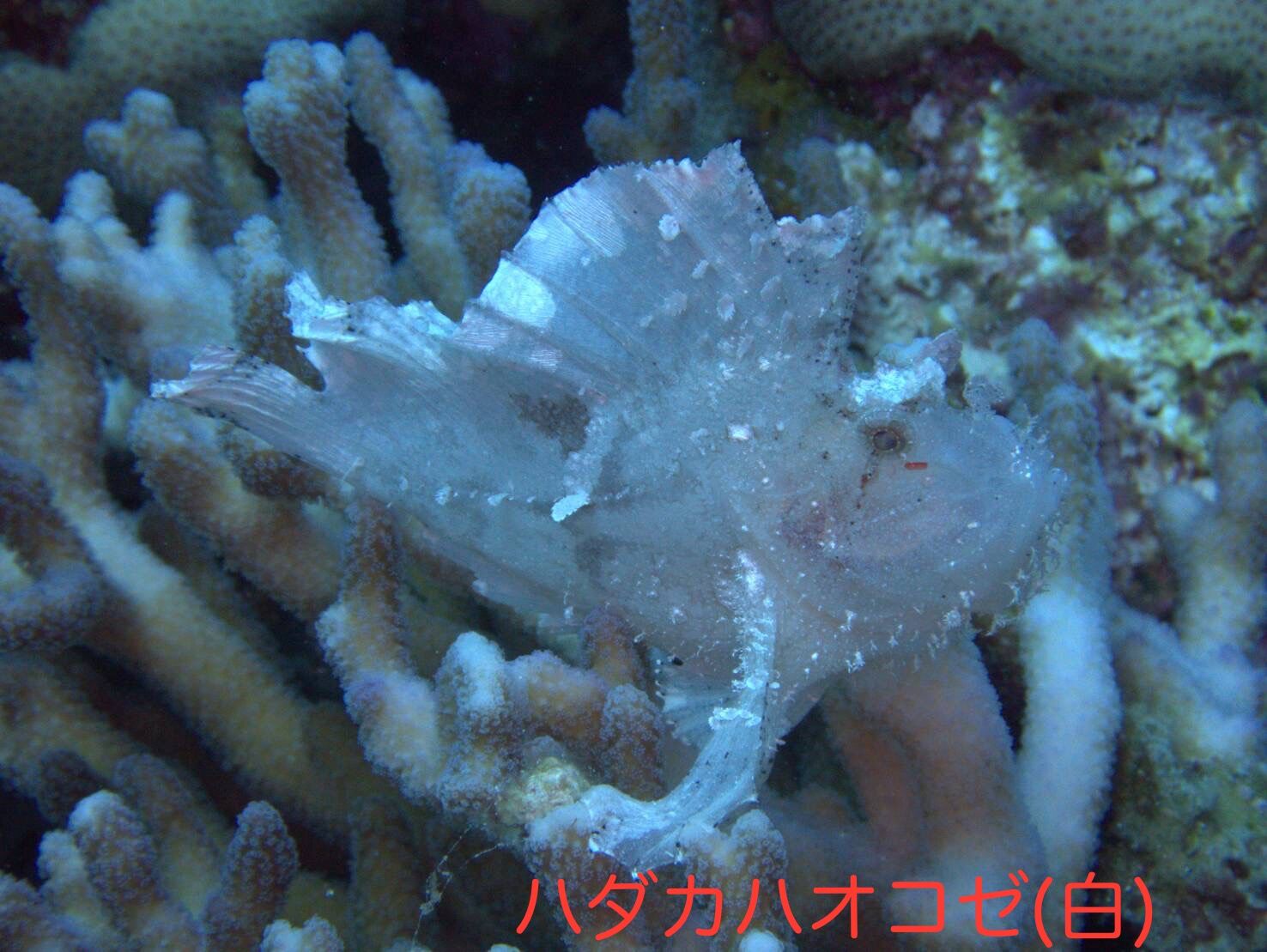 特徴: 体が平べったく、葉っぱのようにゆらゆら揺れながら岩場やサンゴに身を潜めています。色は白・黄色・ピンクなど個体によって違います。慶良間諸島では紫や黄緑のハダカハオコゼをよく見ますが、白と出会ったのは初めてでした!
