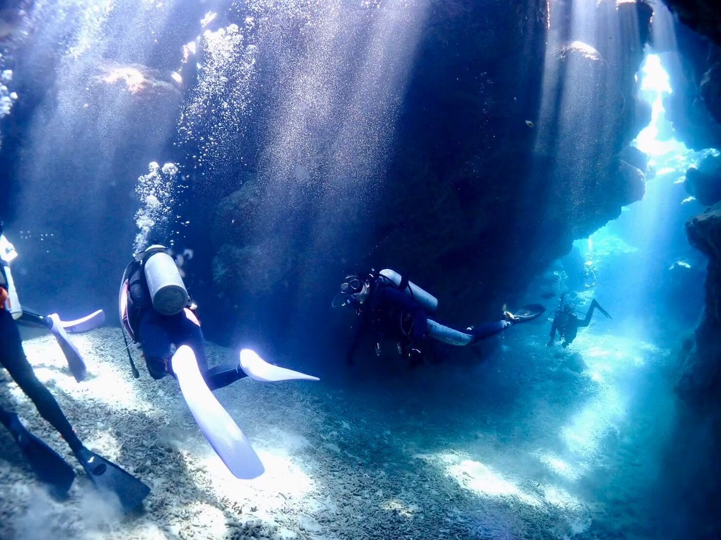 慶良間では、魚やサンゴだけでなく、地形の面白さも魅力です。とくに洞窟に差し込む光は、まるで海の中にカーテンができたみたいで、とても幻想的なんです!