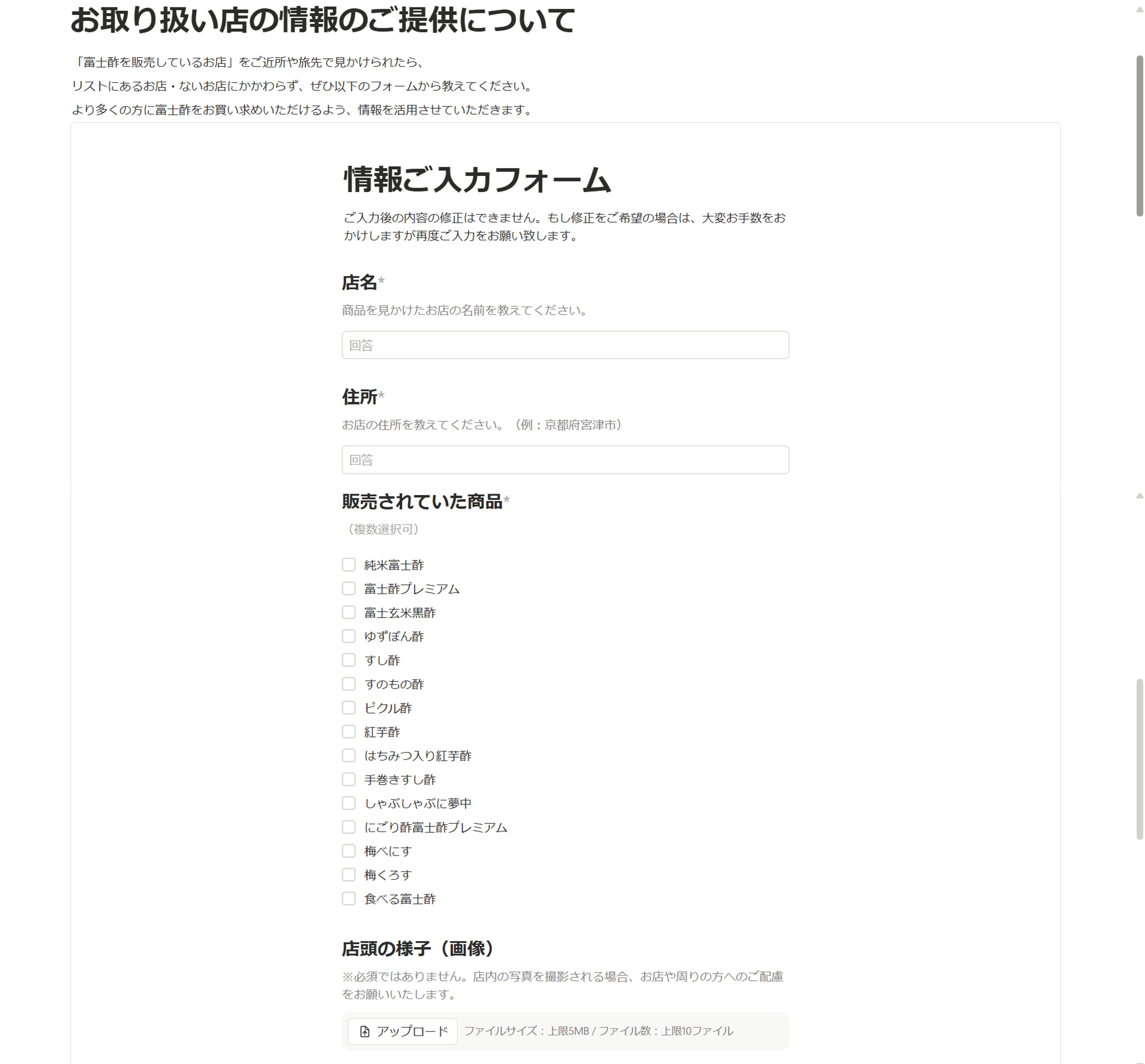 ぜひ、お客様と一緒に「レストランマップ」や「富士酢お取扱店リスト」コンテンツを増やしていけたらうれしいです。引き続き、ご協力をお願いいたします。