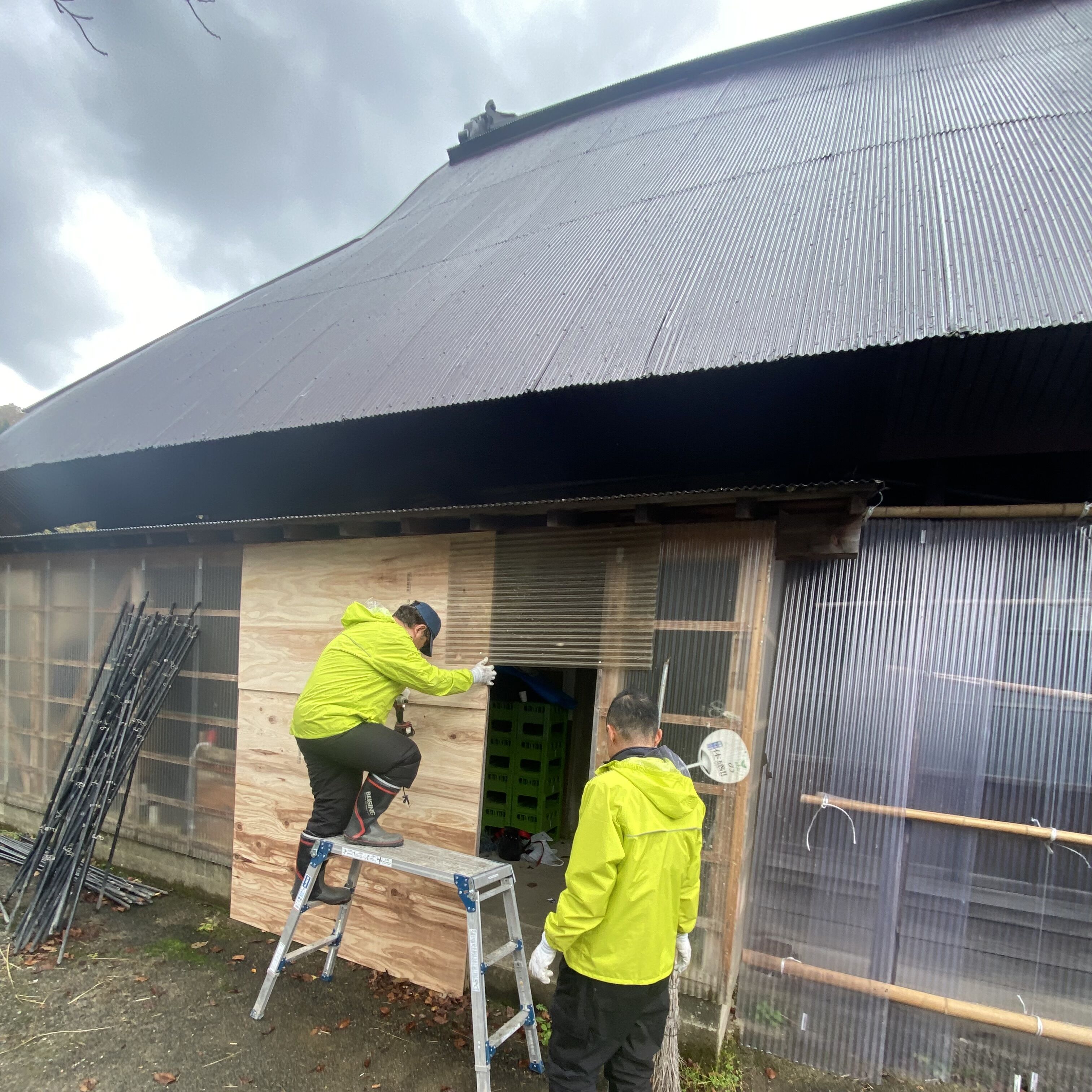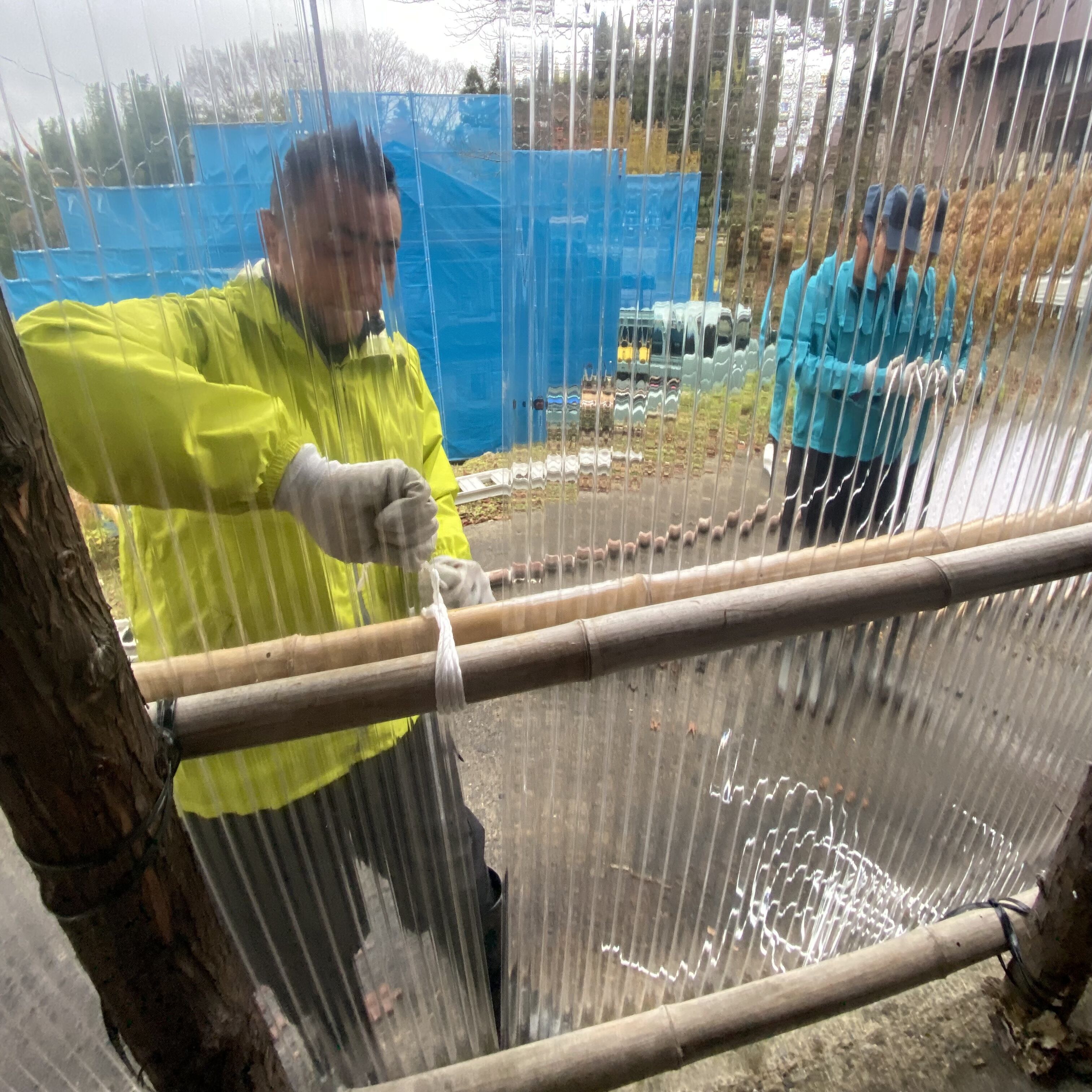 入り口のガラス窓を外側内側から竹と波板で囲いを作っていきます。