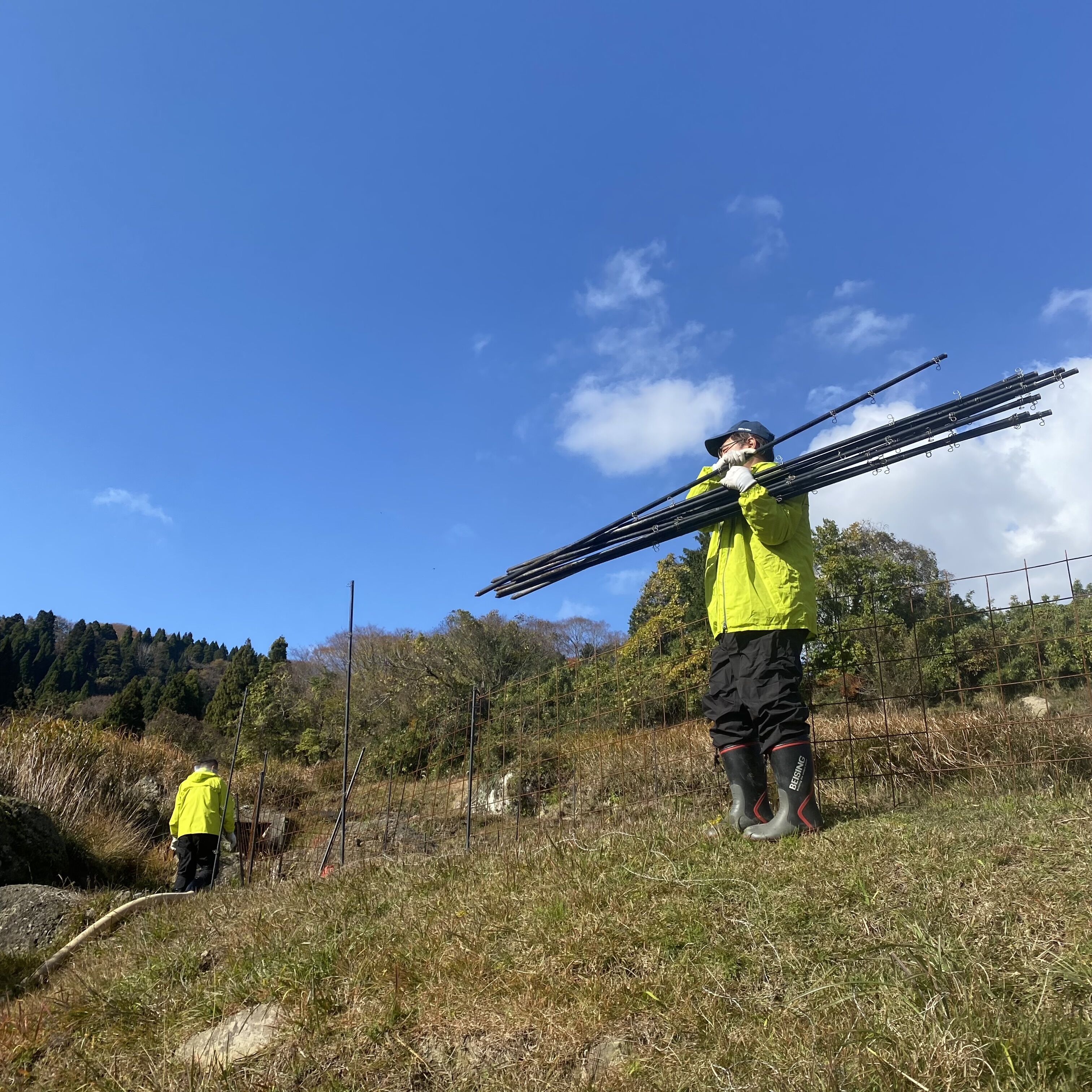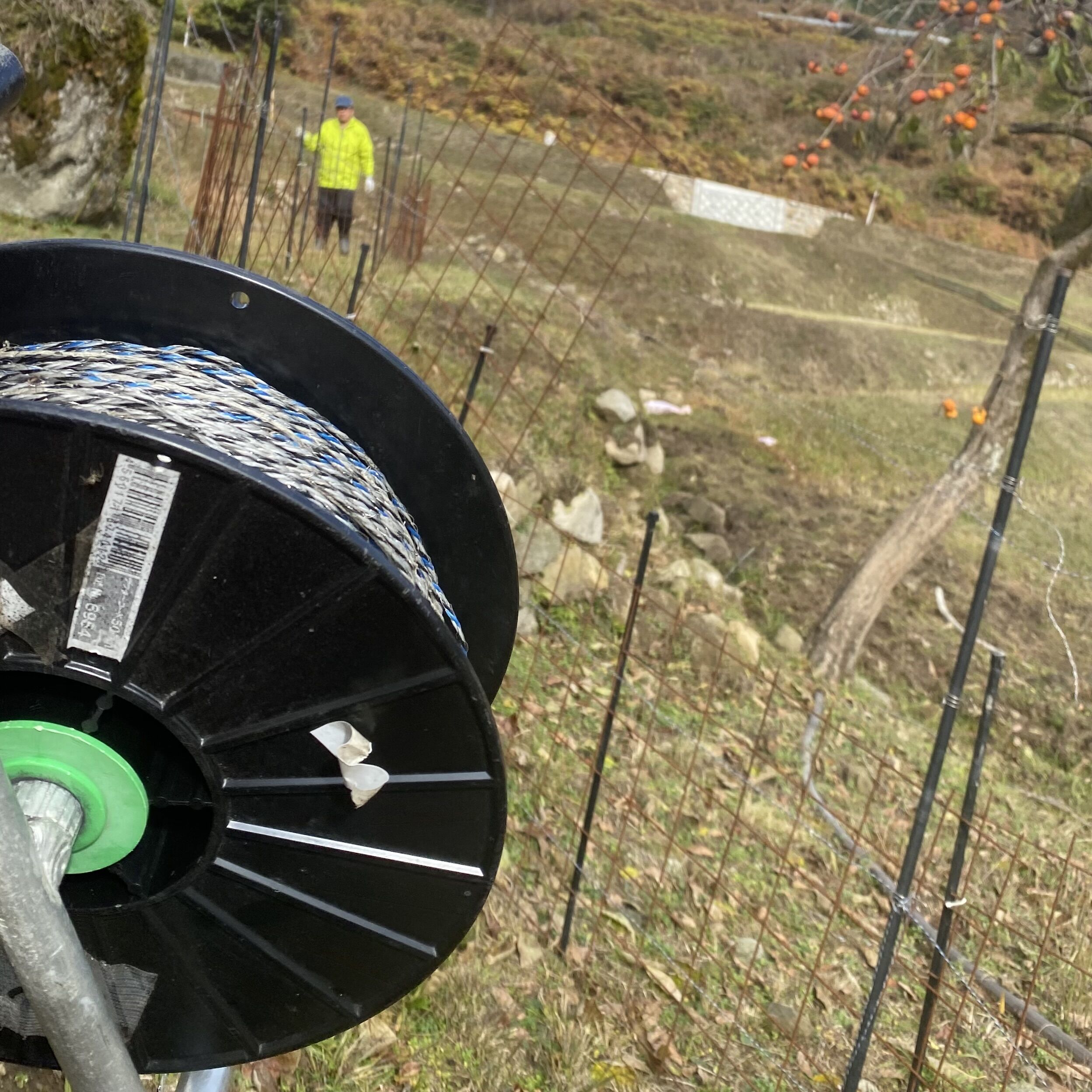 電気柵のワイヤーを巻き取り、棒を抜いて持ってかえります。今日のドレスコードはイエローブルゾンだったようです🥼