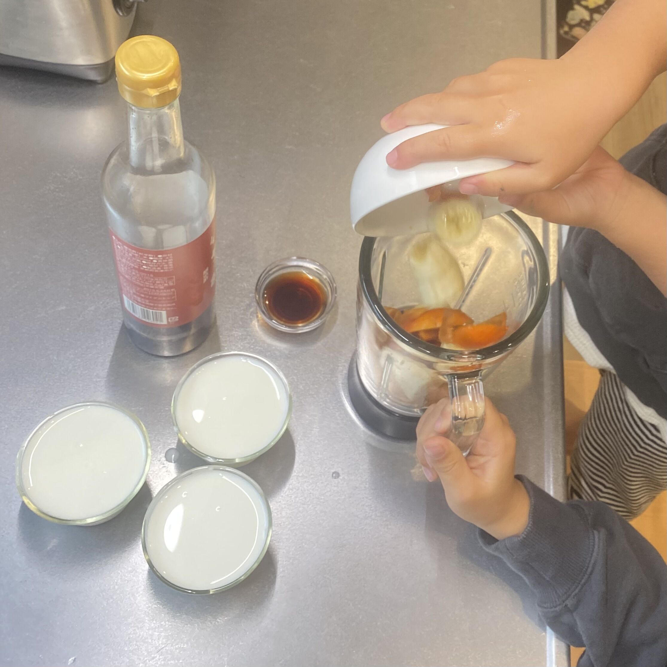 次男くん担当はカットフルーツをミキサーに投入🖐️