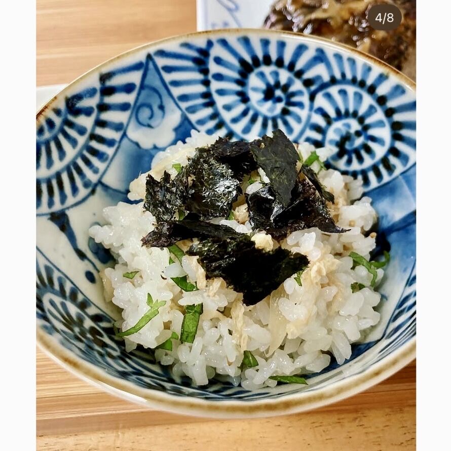 酢飯に、お揚げの甘煮、千切りのガリ、大葉、胡麻を混ぜ合わせました。甘さと辛み、爽やかさのバランスが良い一品です。