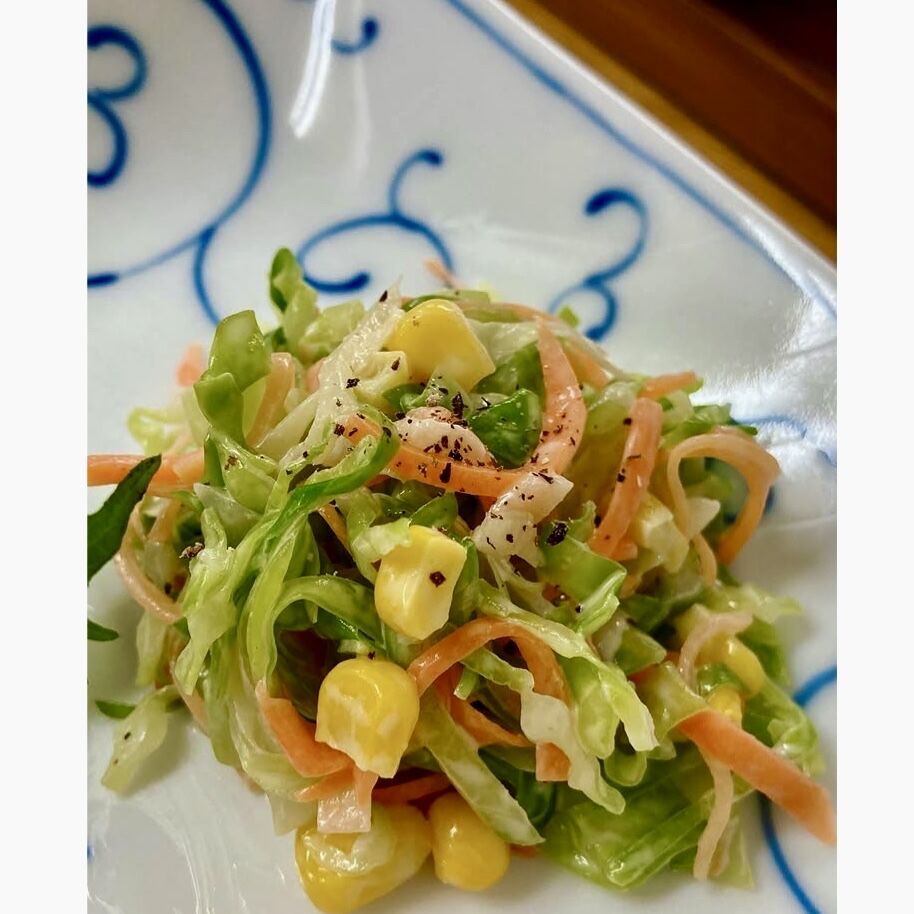 キャベツ・にんじん・コーンに千切りのガリを加え、マヨネーズ・塩・胡椒・レモン汁で和えました。シャキシャキとした食感と爽やかな味わいで、お弁当にもおすすめです。