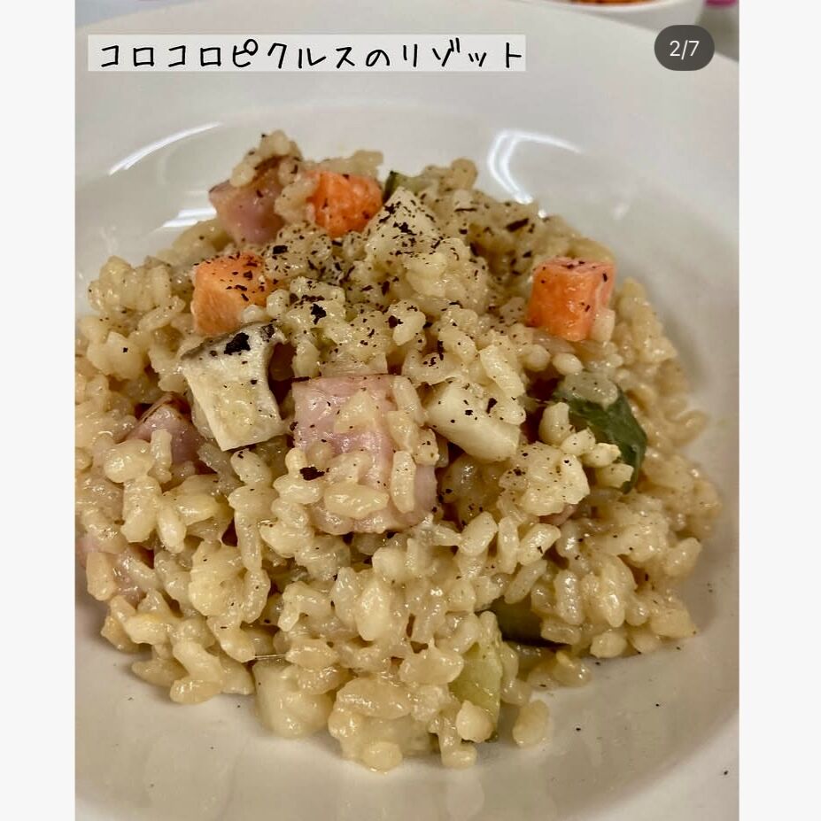 人参・大根・きゅうり・エリンギのピクルスとカリカリベーコンをチーズリゾットに加えました。食感とほどよい酸味が楽しい一品です。