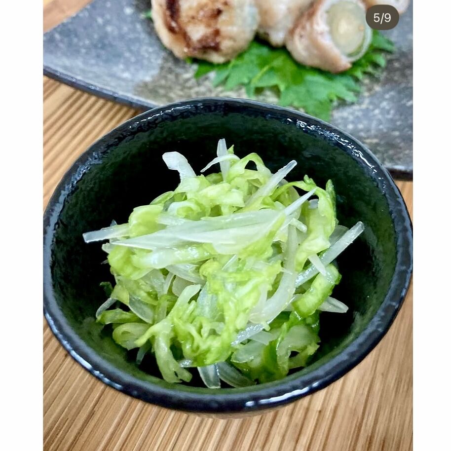 塩もみした千切りキャベツと千切りのらっきょうを合わせ、らっきょうの漬け汁を加えました。シンプルながら歯応えがよく、箸休めにぴったりです。